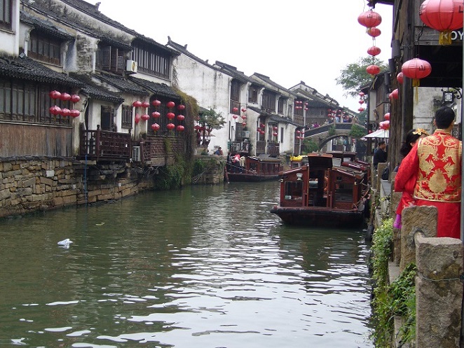 ここは「東洋のベニス」と言われる水郷の街で、中国らしい歴史的建造物やシルクを名品とする店舗、レストランや茶店など、まさにひと昔の中国の街を表す風景です。