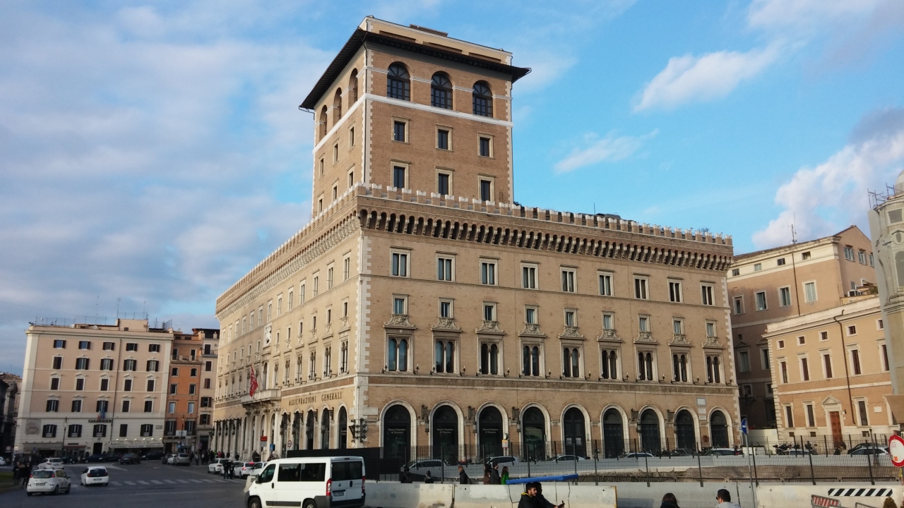 ベネチア広場は、ローマの中心部に位置していて「ローマのへそ」とも呼ばれる広場です。ベネチア広場という名前は、16世紀のヴェネツィア共和国のローマ大使館の役割をするベネチア宮殿が広場のすぐ隣に位置しているからだそうです。北コルソ通りがポポロ広場まで伸びていて、第二次世界大戦時に独裁者ムッソリーニがベネチア宮殿を執務室として使用したこともあります。