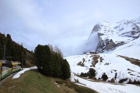 午前中は快晴の下、ミューレン・ラウターブルンネンあたりの散策を楽しんだのですが、昼過ぎにクライネシャイデックまで上がって来ると一転、空はどんより。雪さえチラついてきました。んー、残念。山の天気は変わりやすいというのは本当ですね。そんなわけでユングフラウ鉄道への乗り換えは取り止めてグリンデルワルト方面へ下りました。