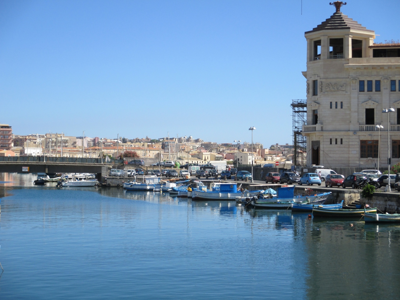 駅からウンベルト1世通りを行くと、このウンベルティーノ橋を渡って、オルティージャ島へ渡ることになります。この橋と平行なNuovo橋の上には、遊覧船や街を回るバイクタクシーのような乗り物の客引きをしています。私は10ユーロの街を1周するバイクタクシーのようなものに乗りました。
