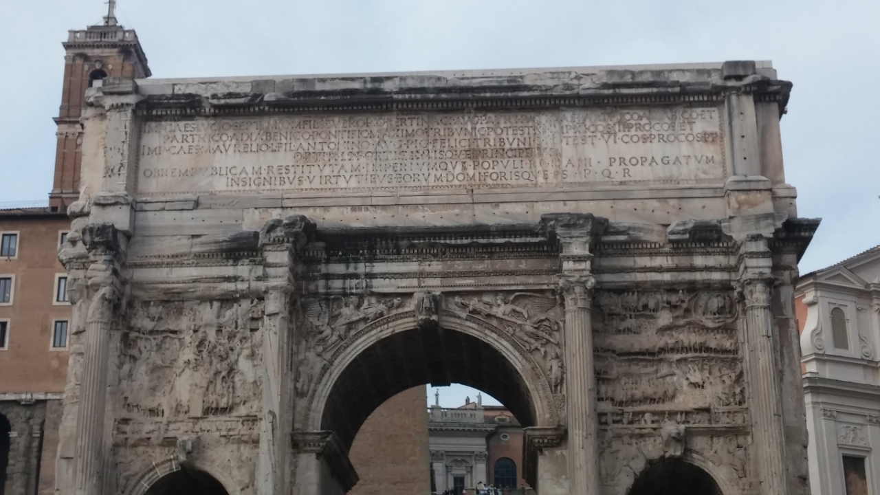 現存するローマの3大凱旋門は、コロッセオの横にあるコンスタンティヌス凱旋門、フォロ・ロマーノの両端に存在するティトゥスの凱旋門とすぐセヴェレスの凱旋門です。セヴェレス皇帝が西暦203年に即位10周年を記念するために造らしたそうです。洗練された彫刻で凱旋門の威厳が感じられました。