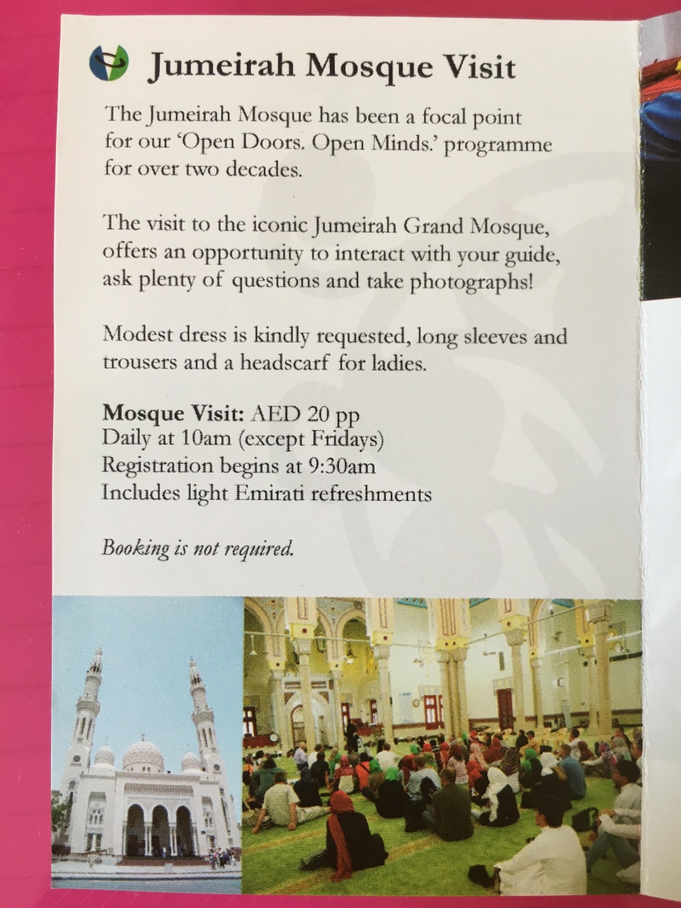 半そで、半パンで来てしまった人はモスク入口で民族衣装(アバヤ、カンドゥーラ)を借りることができる。モスク内写真撮影OK。モスク見学前にアラビアコーヒー、デーツなどアラブの軽食が提供される。見学料は20AED。