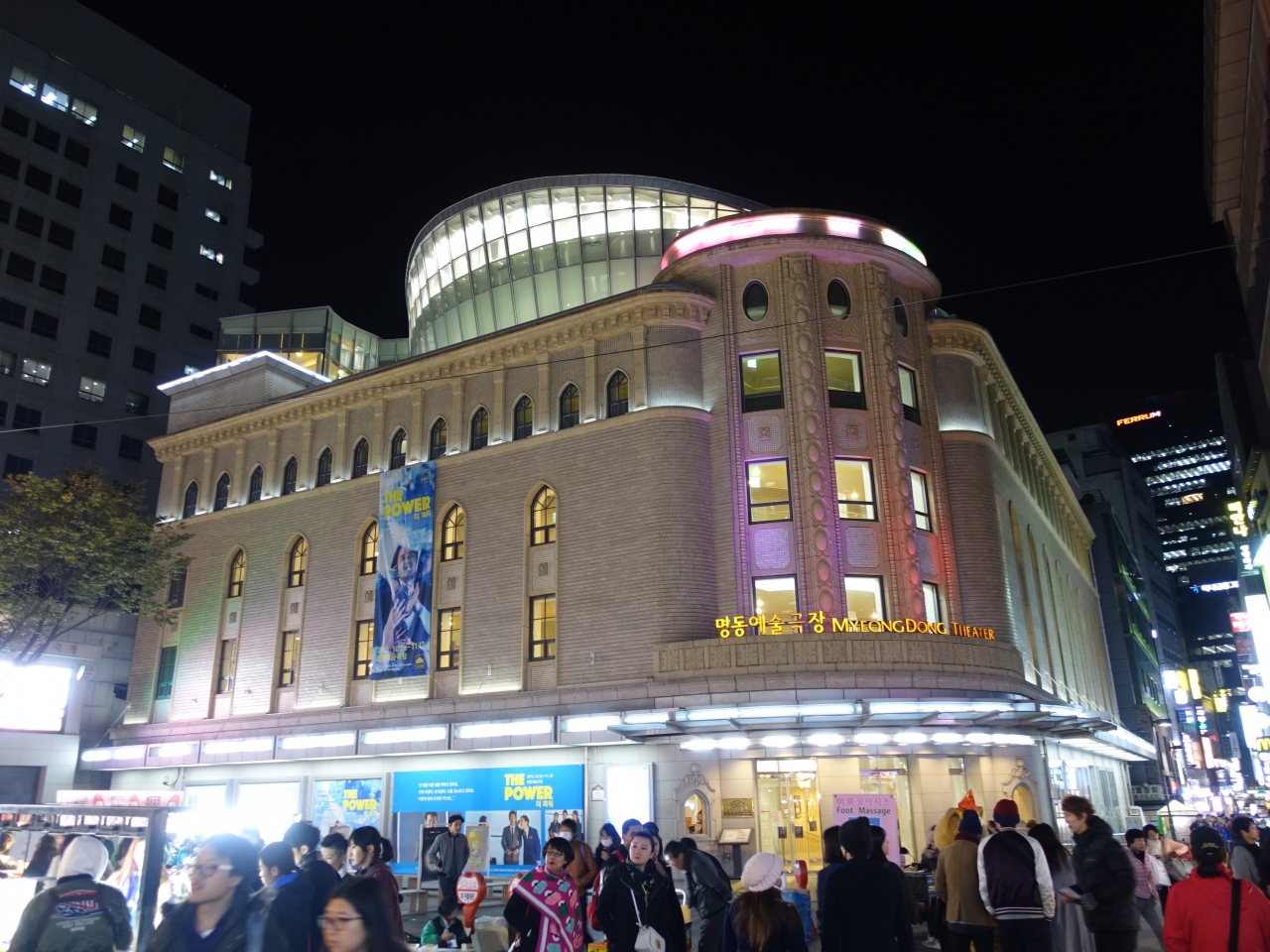 明洞の中心部近くにあり、屋台が並ぶ場所から近いことから、夜でも人通りが多い場所です。劇場の前にはお洒落なベンチの置かれたスペースがあり、寒い中、おしゃべりをしている人たちも多かったです。重厚さを感じさせる建物です。