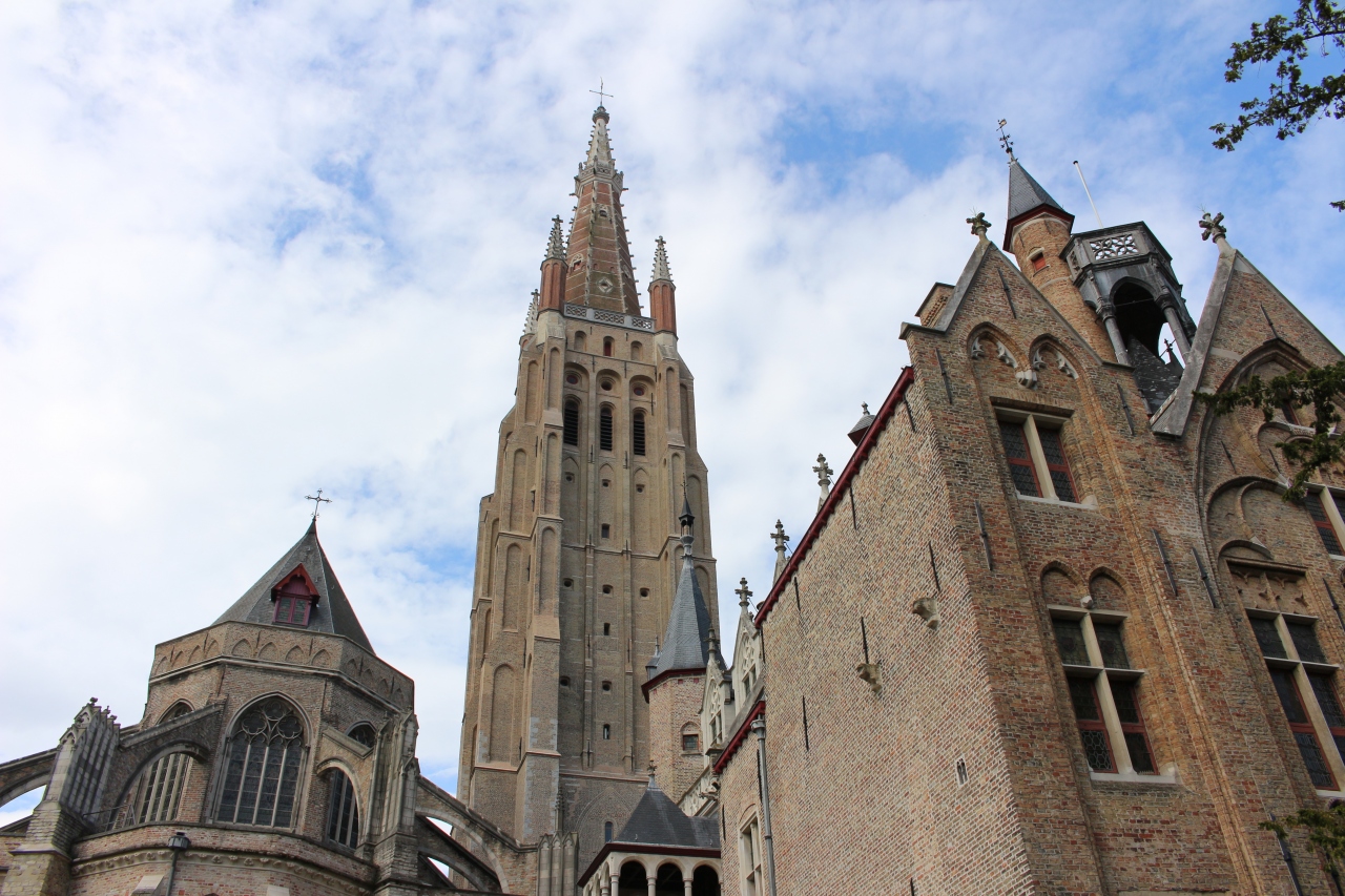 ブルージュの街を歩いていると目に着くひと際高い建造物が、鐘楼とこの教会の塔です。。多くの所から、このどちらかが目に入ってきます。先端が筒状なのが鐘楼、尖っているのが聖母教会の塔です。こちらは、近づくと大きすぎて全景がうまく捉えることができないくらいです。