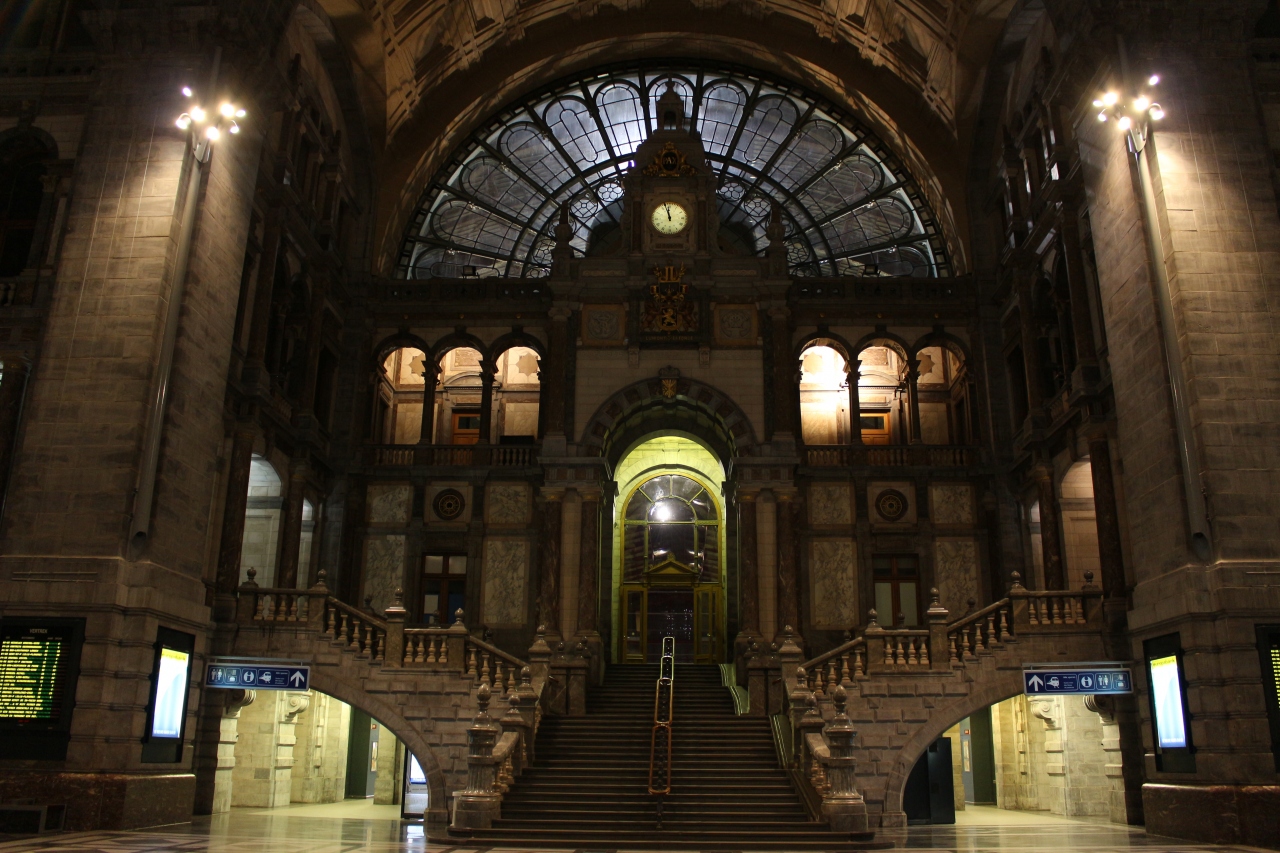 アントワープの駅には夜到着したのですが、駅のホールが壮麗でした。また外観も趣向を凝らした建築になっています。ブリュッセルもブルージュも、駅は味気ない建物でしたが、なぜかここだけは印象的な建物となっていました。