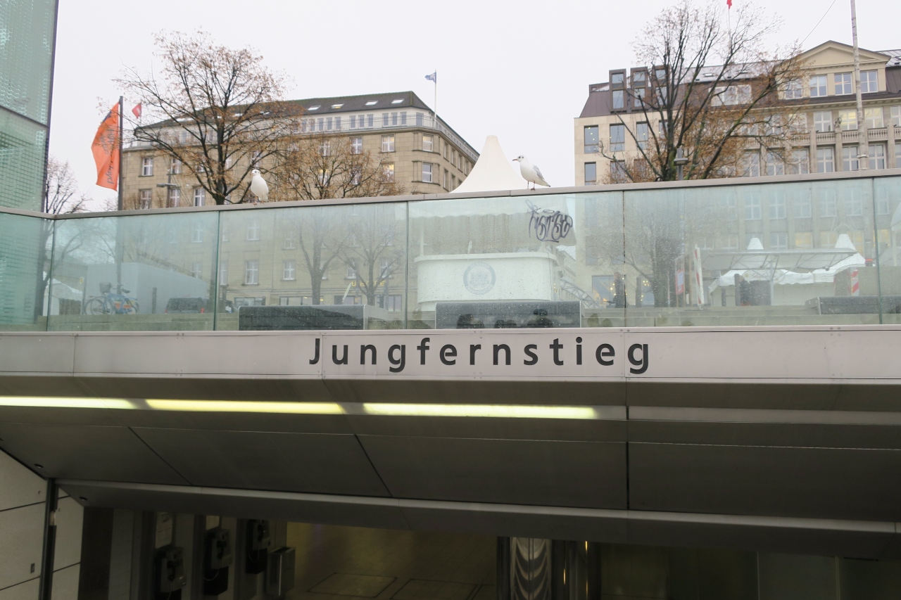 電車を降りて階段を上がると、すぐそこにアルスター湖があり、そのわきではクリスマスマーケットの準備が進んでいました。