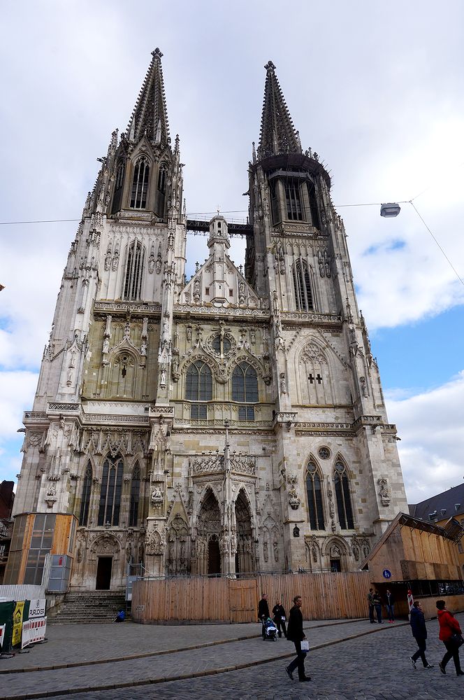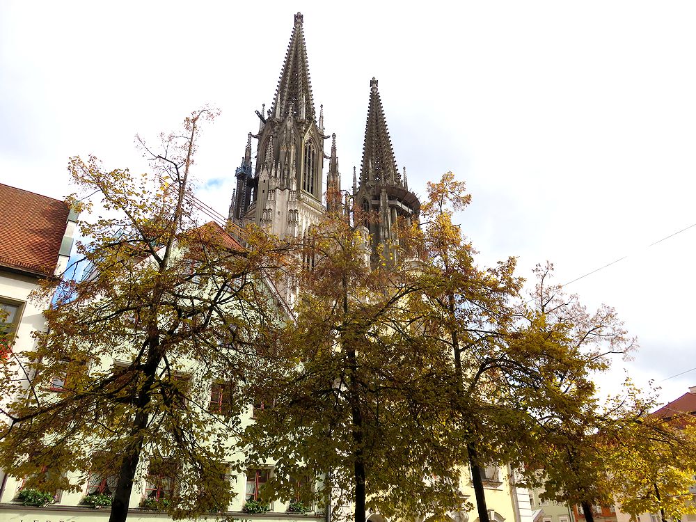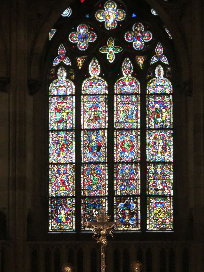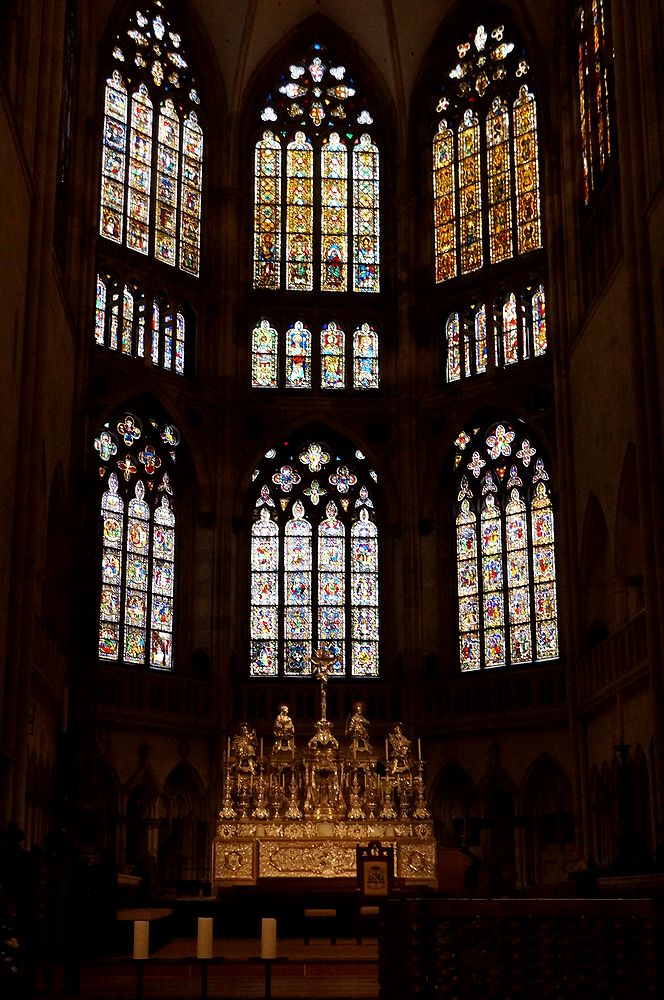 駅前から延びるマクシミリアン通りを北へ旧市街をめざして10分ほど歩くと、2つの尖塔をもつ大聖堂の前に着きます。私達が訪れた時は残念ながら外観はいまだに改装中でした。中に入ってみると、ステンドグラスの素晴らしさに圧倒されました。一部新しいものもありますが、大半は14世紀のものだそうです。内部は撮影可だったので、写真を撮りまくってしまいました。さらに2009年に造られた世界最大の壁かけ型のパイプオルガンが印象的でした。約37トンの重さがあり、4本の鋼鉄ロープでつるされていて、演奏者はエレベーターで昇って、演奏するのだそうです。