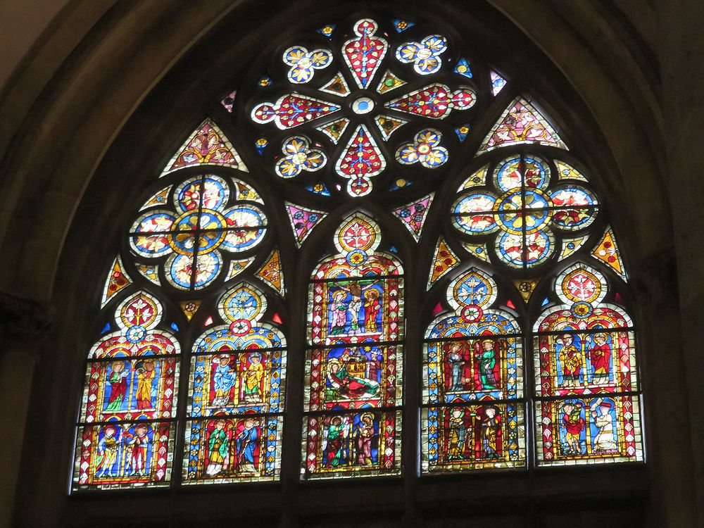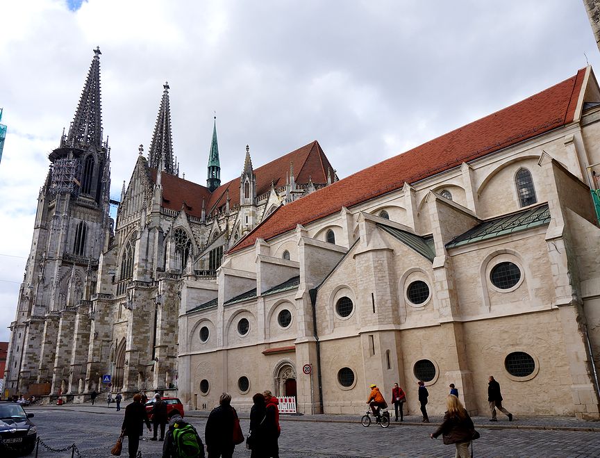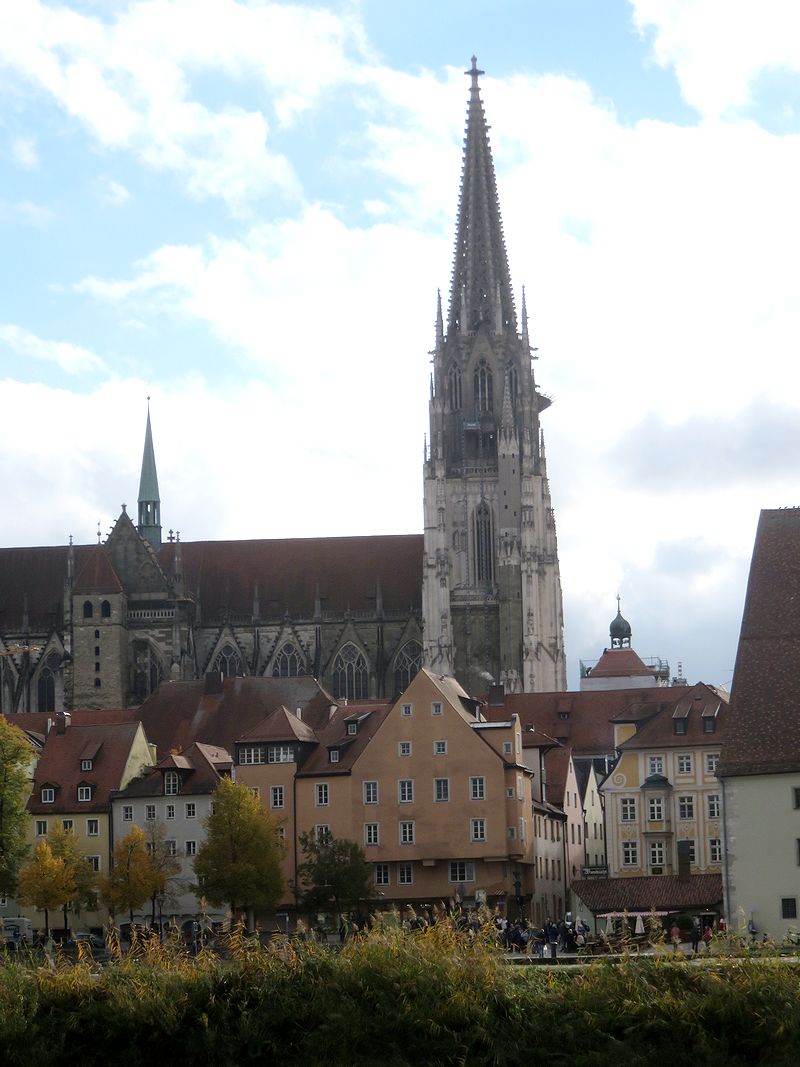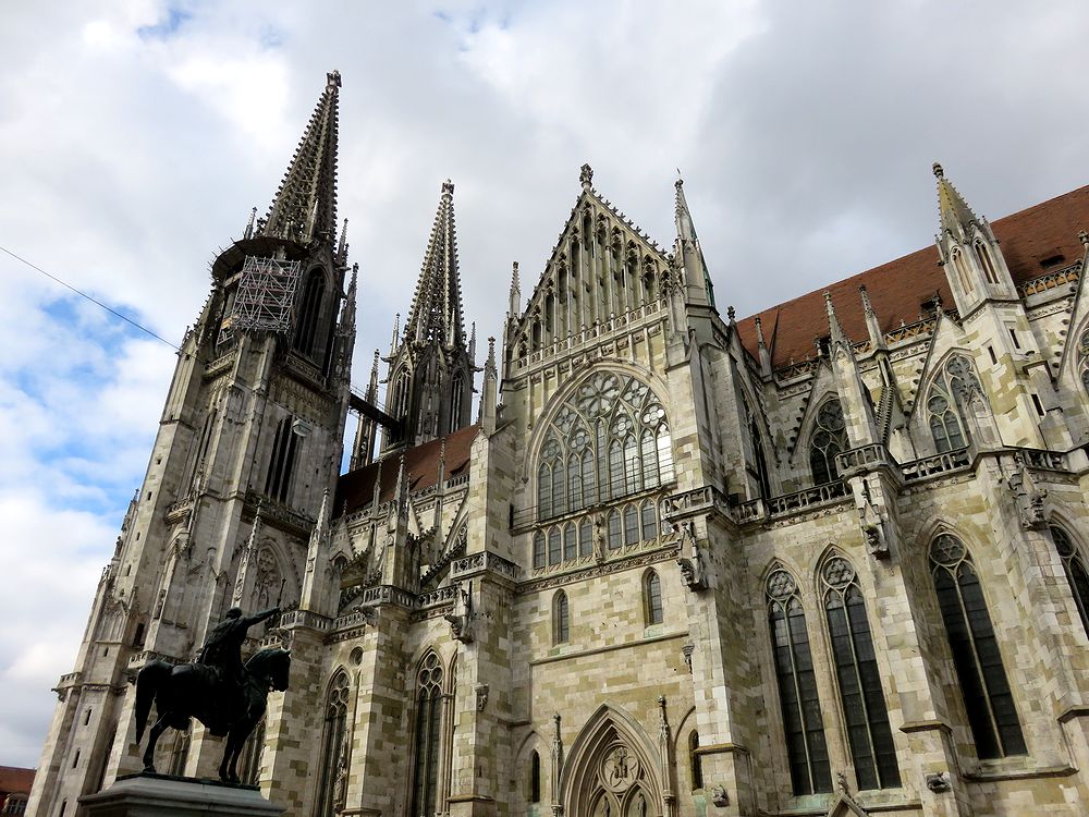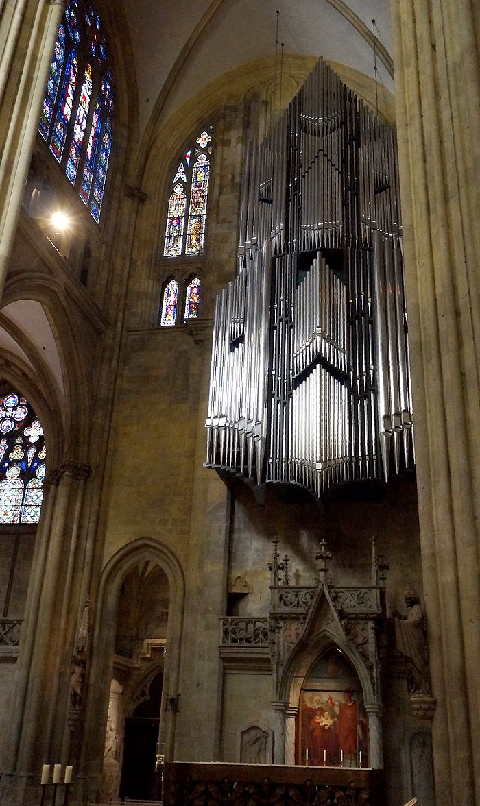 駅前から延びるマクシミリアン通りを北へ旧市街をめざして10分ほど歩くと、2つの尖塔をもつ大聖堂の前に着きます。私達が訪れた時は残念ながら外観はいまだに改装中でした。中に入ってみると、ステンドグラスの素晴らしさに圧倒されました。一部新しいものもありますが、大半は14世紀のものだそうです。内部は撮影可だったので、写真を撮りまくってしまいました。さらに2009年に造られた世界最大の壁かけ型のパイプオルガンが印象的でした。約37トンの重さがあり、4本の鋼鉄ロープでつるされていて、演奏者はエレベーターで昇って、演奏するのだそうです。
