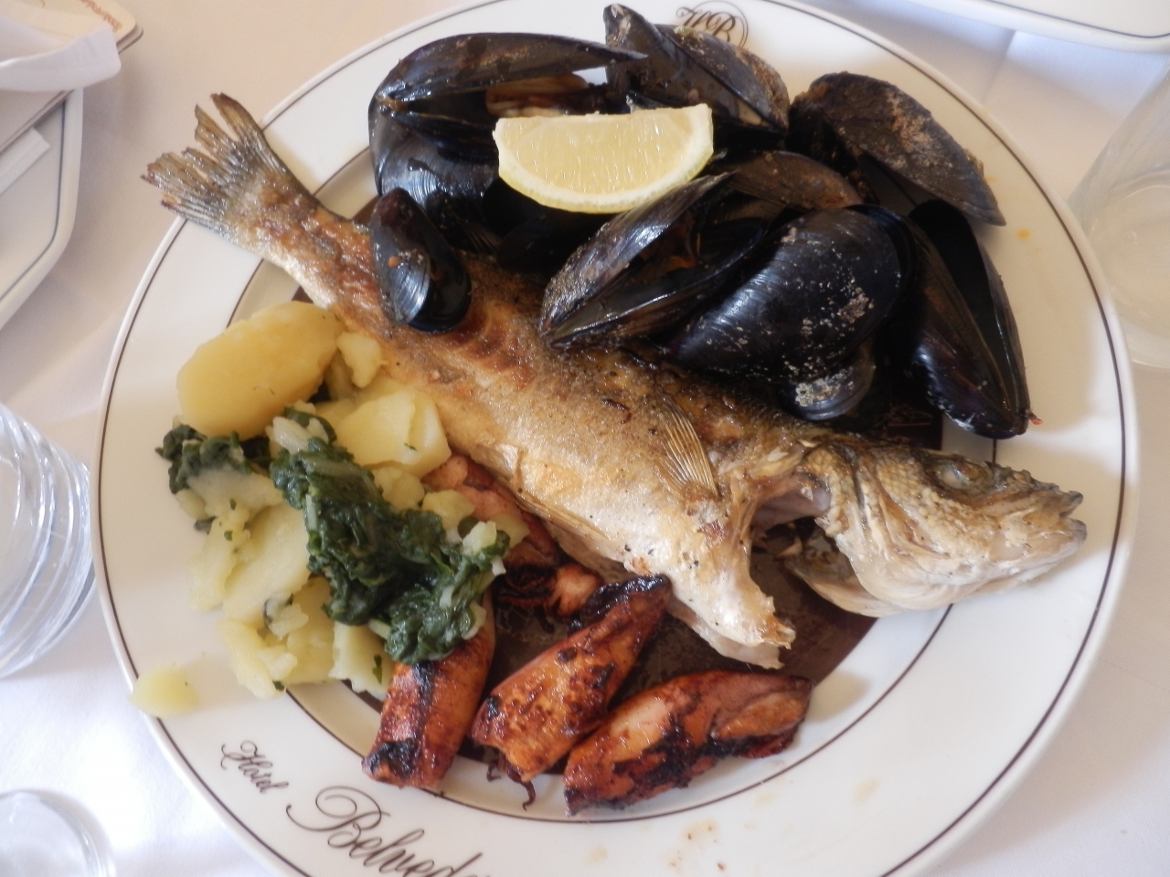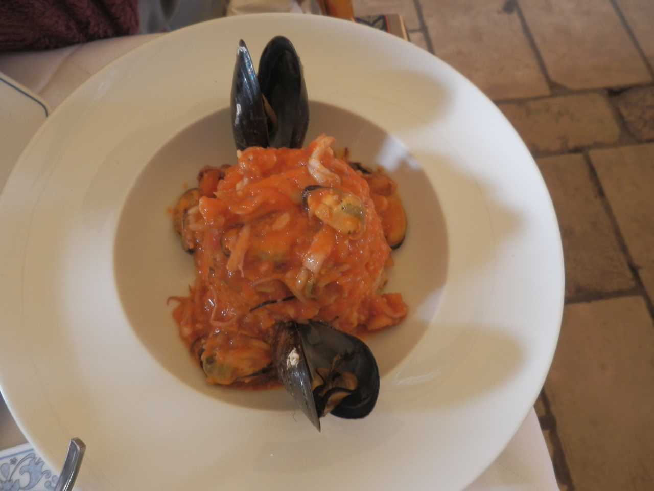 ここは人気店のようで結構混んでいました。シーフードがおいしいお店なので、魚介の盛り合わせ、リゾット、スープを注文しました。魚介の盛り合わせも、いか、ムール貝、魚などたくさん入っていました。どれもおいしかったです。外のテラスで食べると雰囲気がとてもいいです。日本語のメニューもあります。