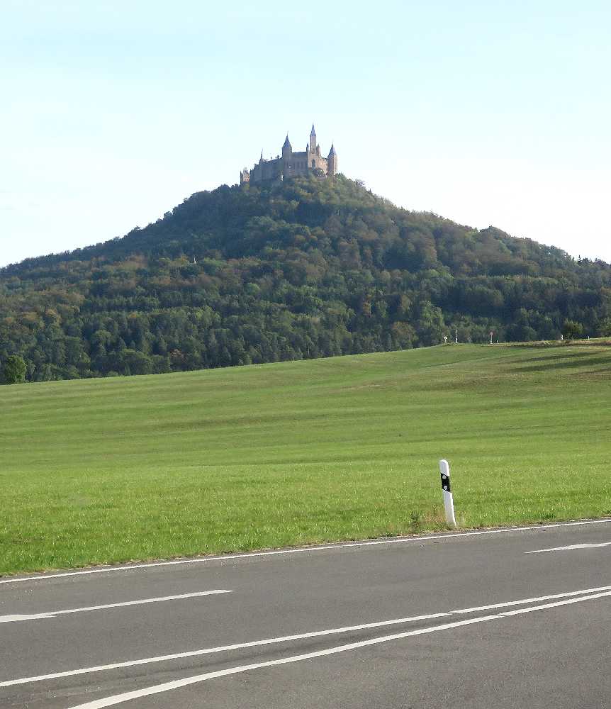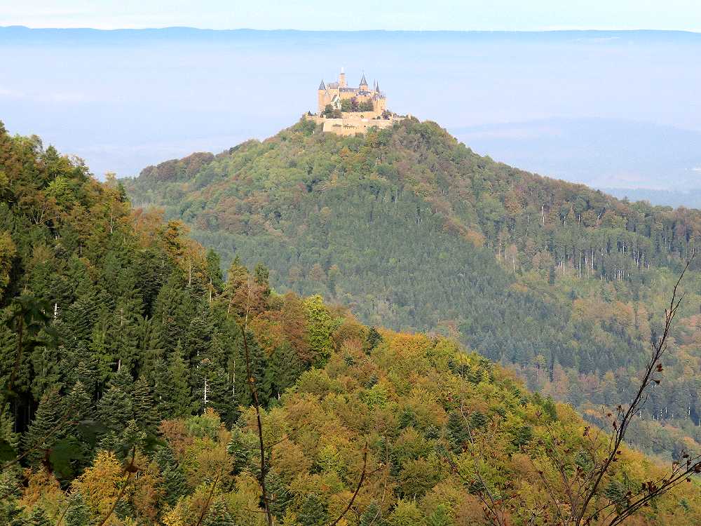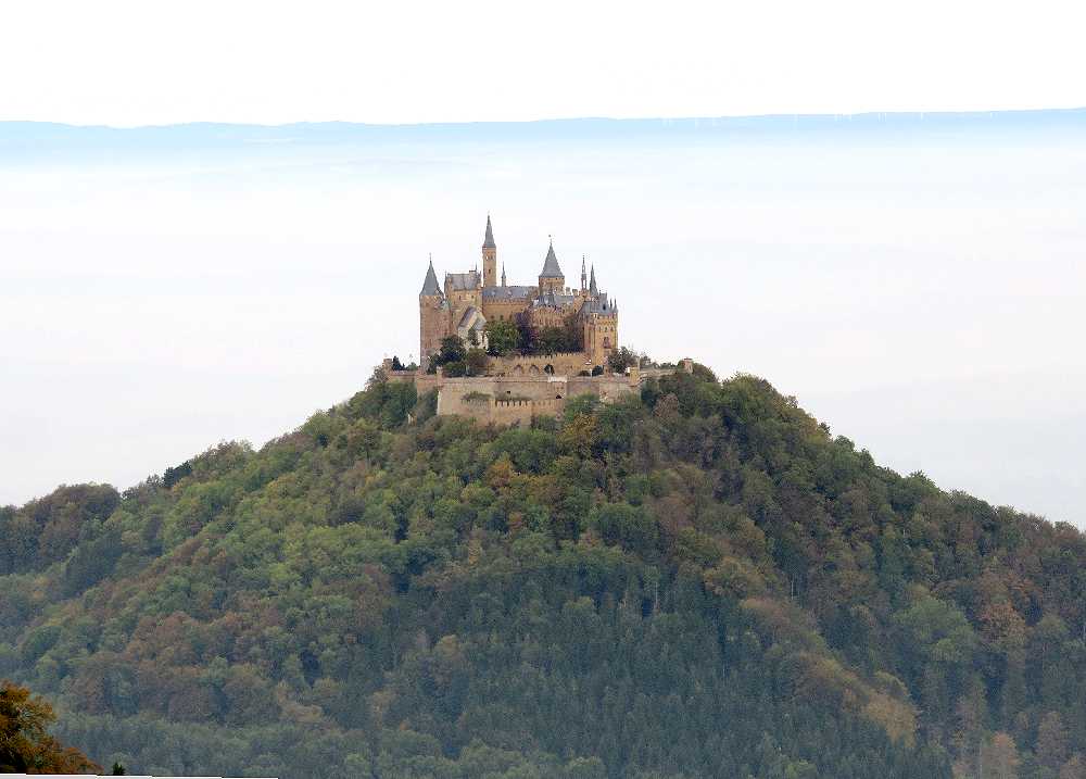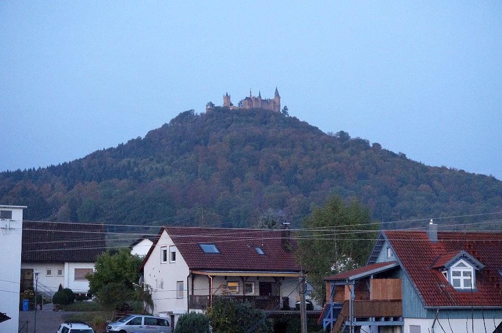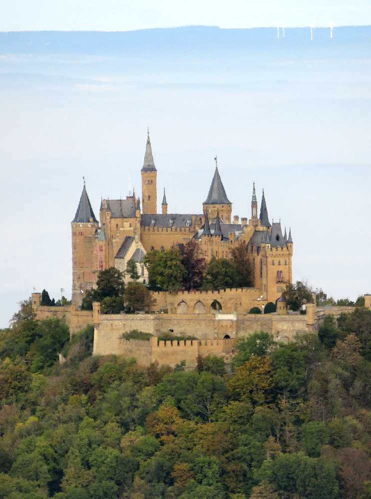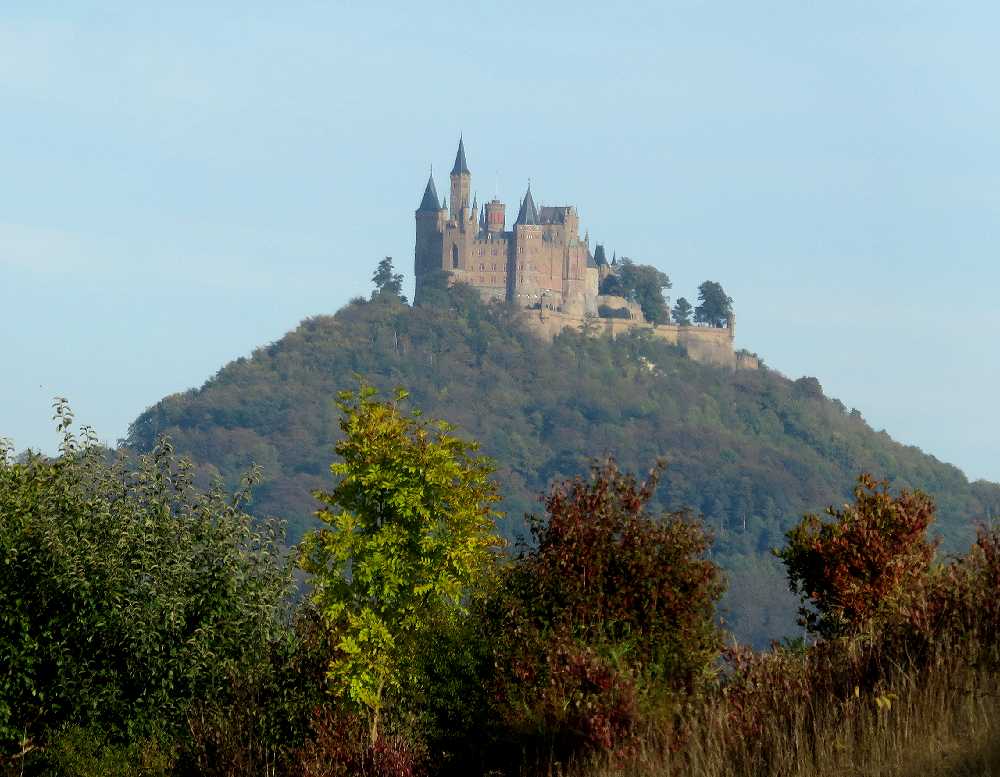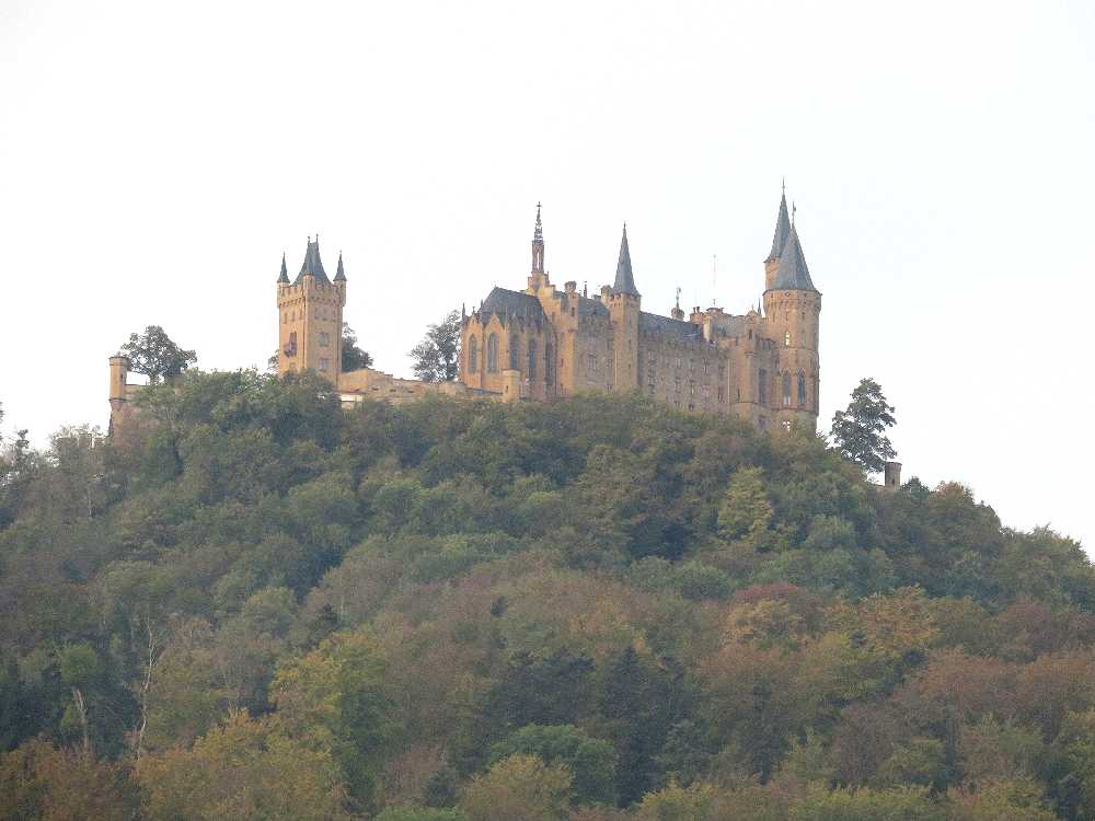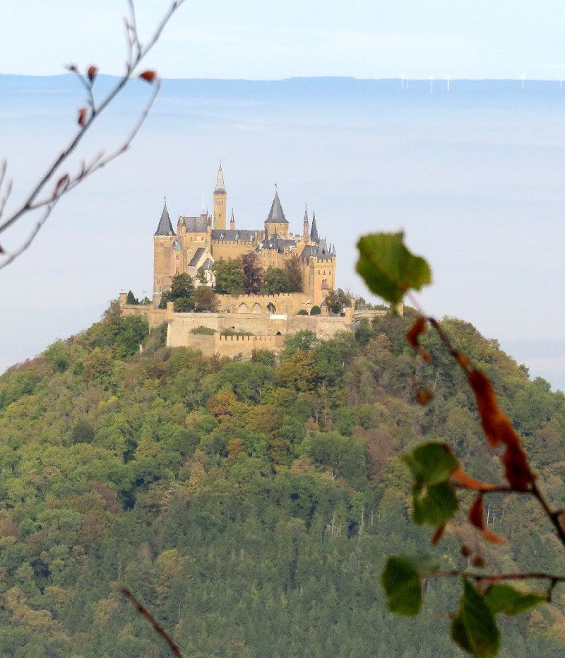 ドイツの三大名城の一つですが、行きにくいということからか、日本ではノイシュヴァンシュタイン城やハイデルベルク城ほど有名ではありません。しかし、円錐形の山の上に聳える城の姿は素晴らしいです。私達が初めて目にしたのは2005年のドライブ旅行の途中で、城の近くの駐車場まで車で行き、シャトルバスでお城まで送っていただき、内部を見学しました。内部は撮影禁止だったせいか、写真が残されておらず、中の様子はまったく記憶に残っていません。2016年10月の紅葉の季節に城の真下のゲストハウスに宿泊し、宿から真近にすばらしい城を見上げることができたのですが、翌日朝,お城の隣の山(Reichberg)までドライブし、山上のホテル前に駐車し、そこから牧草地を歩くこと5分ほどで、城を見下ろすスポットに到着。紅葉の樹林帯越しに、まるで天空に浮かぶかのように聳える城を目にしたときの感激は忘れられません。公共交通でここまで来るには、ヘッヒンゲンからバスを乗り継いでやってくることになるのでしょうが、ハイキングをするつもりで来れば苦にならないかもしれません。私達ももう一度機会があったら、雲の上に浮かぶ城を見てみたいと思っています。