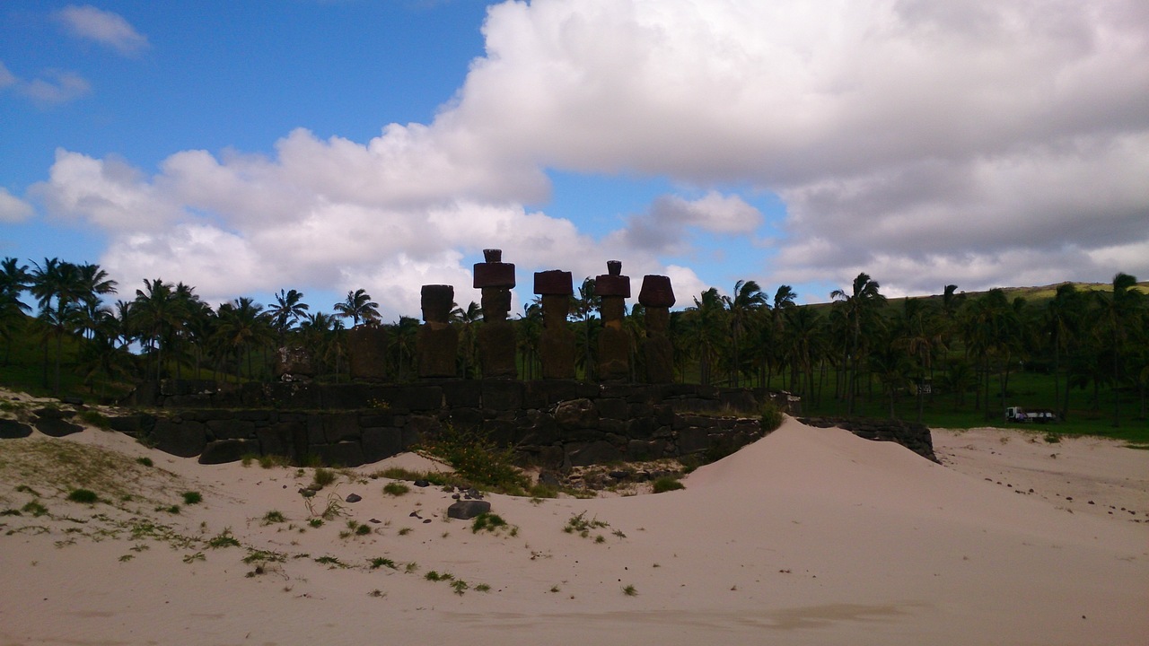 イースター島は波が高く遊泳が禁止されていますが、ここでは泳ぐことができ、地元民の憩いの場となっています。ここにももちろんモアイがいます。白砂とモアイのコントラストがおもしろく、絶景の写真スポットです。