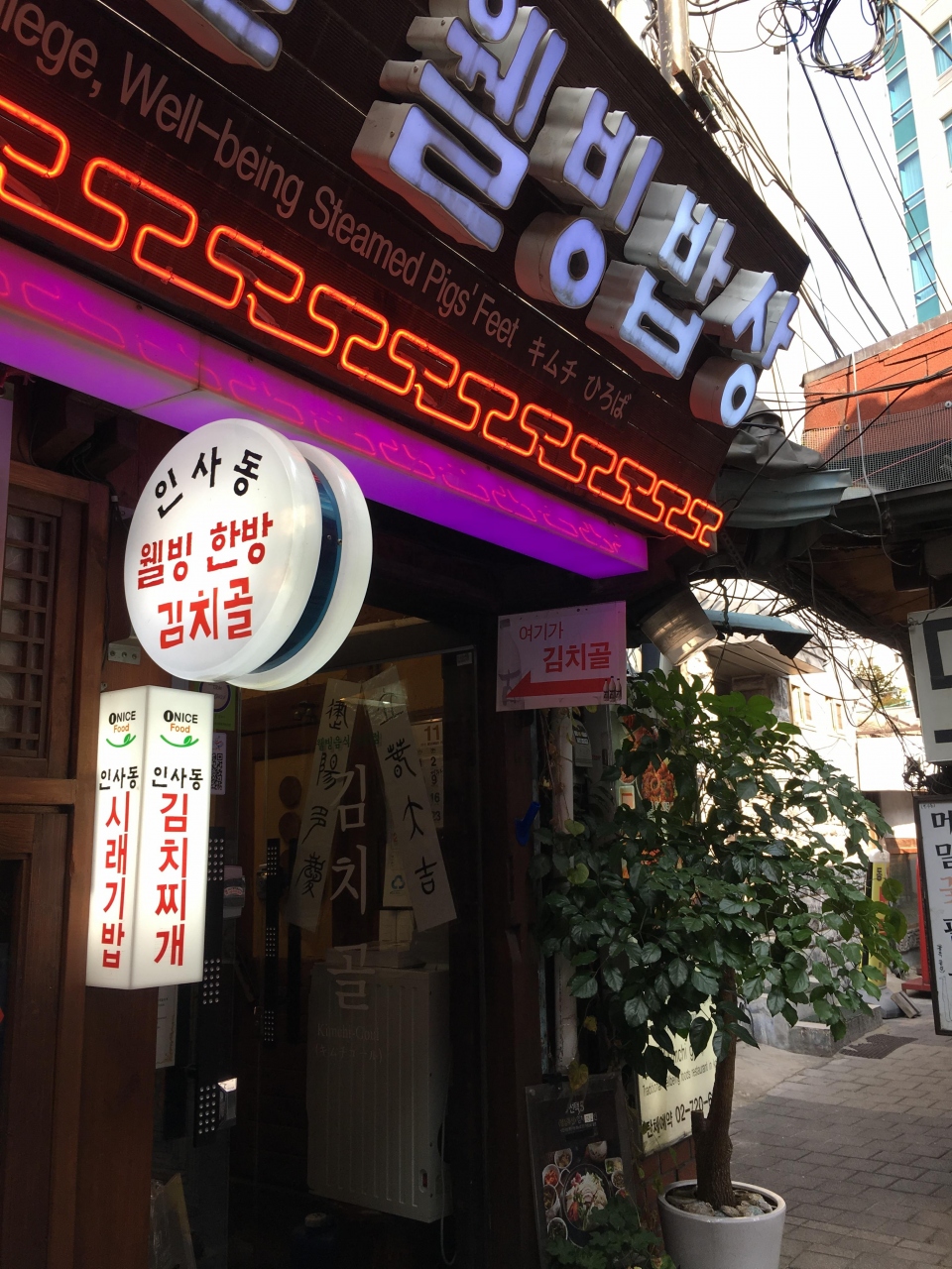 トランジットツアーの昼食が仁寺洞で、自由時間もあったのでメインストリートをぶらぶらしてみました。観光客が多く、活気があります。お土産店はたくさんあり、陶芸品や筆など仁寺洞らしい伝統工芸品だけでなく、コスメや韓国のりなど何でも揃っています。グルメも充実していました。