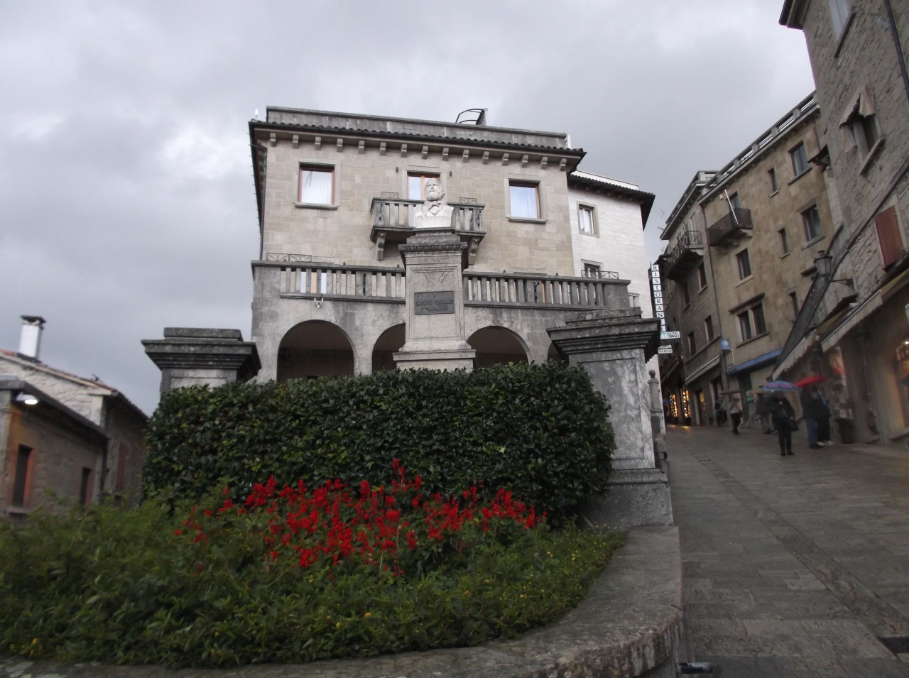 サンマリノの旧市街、坂道を登って行くと、途中の曲がり道の所が花壇になっていて、像がたっていました。