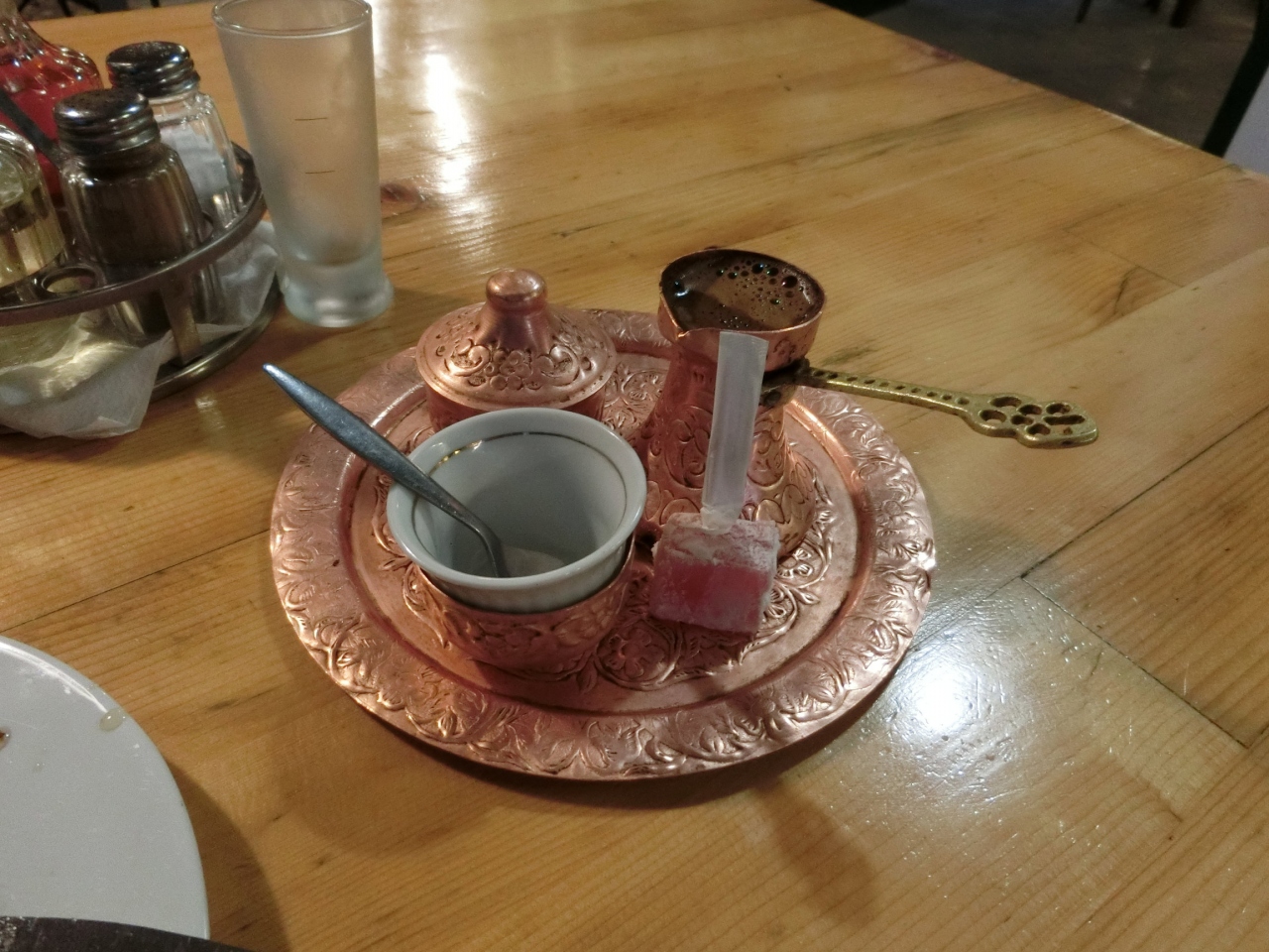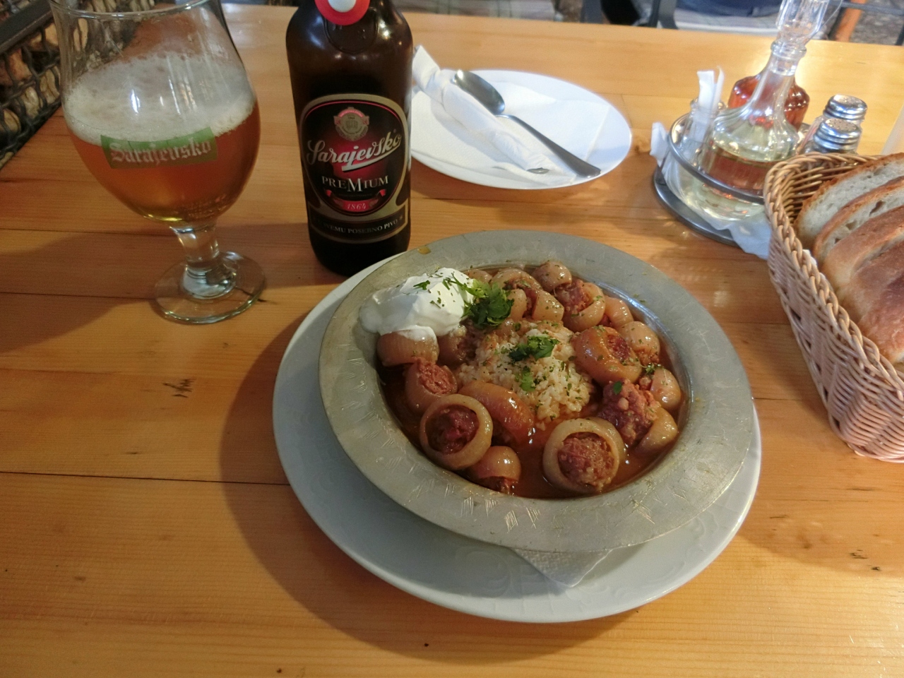 注文したのはビールとSogan Dolmaという玉ねぎの肉詰め料理、デザートにバクラヴァという甘いパイ状のお菓子にボスニアンコーヒーで23マルク程度。