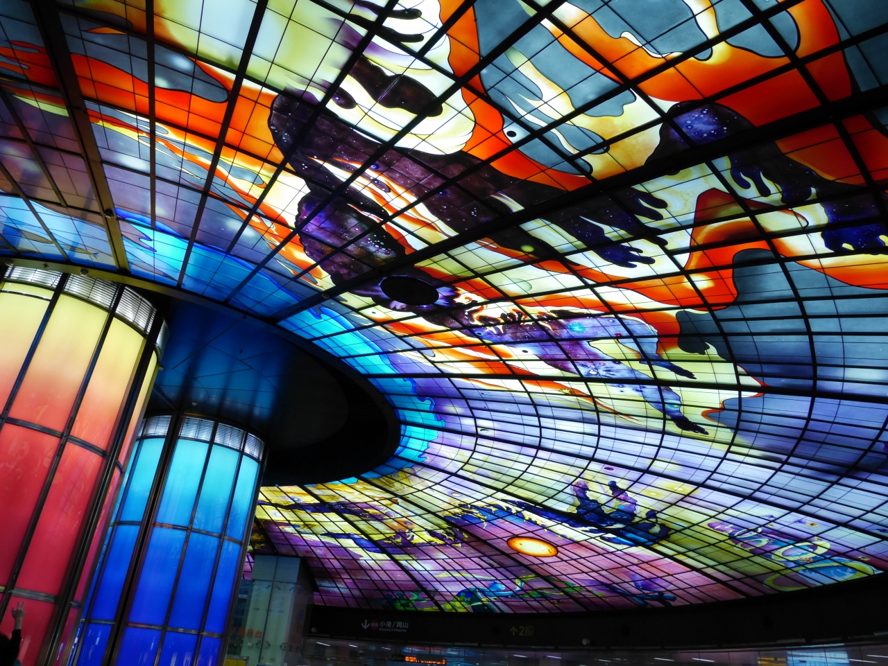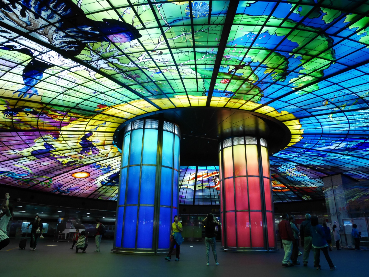 美麗島駅の改札前の広場の天井と柱が美しいライトになっています。このライトを見ようと駅に立ち寄り、写真を撮っていると突然ライトが消えて暗くなった、と思ったライトがいろいろな色に変化するショーが始まりました。とてもきれいだったのですが、このショー、どういったスケジュールでやっているのかは不明です。