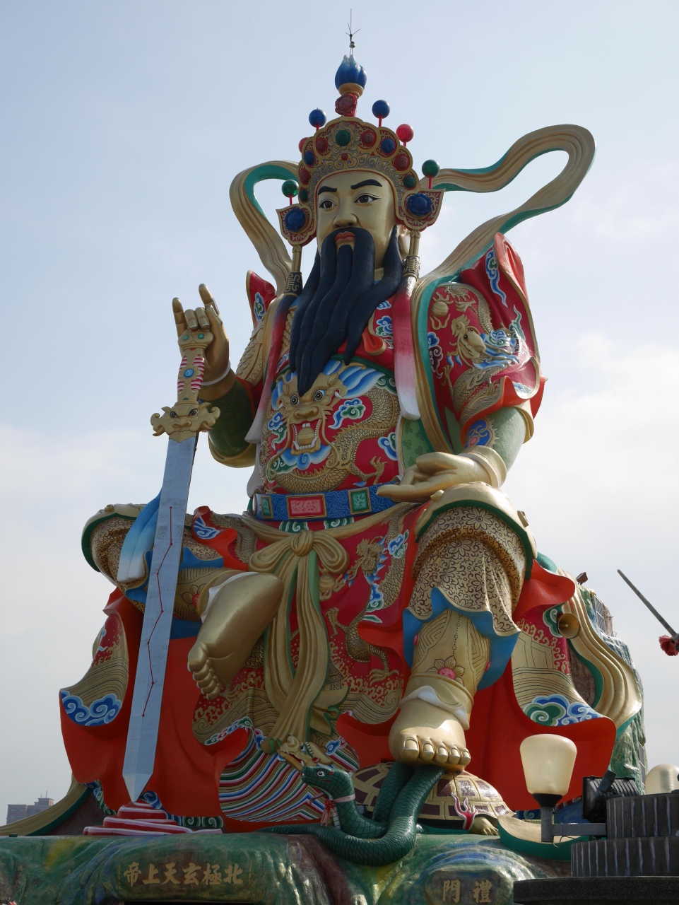 蓮池潭にあります。両側に歴像が並ぶ橋を渡ると巨大な玄天上帝様の像が立っています。中にも入れて、そこには玄天上帝様の像が祀られています。ほかにもお土産物屋さんもありました。 龍虎塔にくらべると観光客もまばらで、訪れているのは憩いに来ている地元に人が多かったです。橋のたもとにカラオケ店があり大音量で音楽を流していたのも印象的でいした。