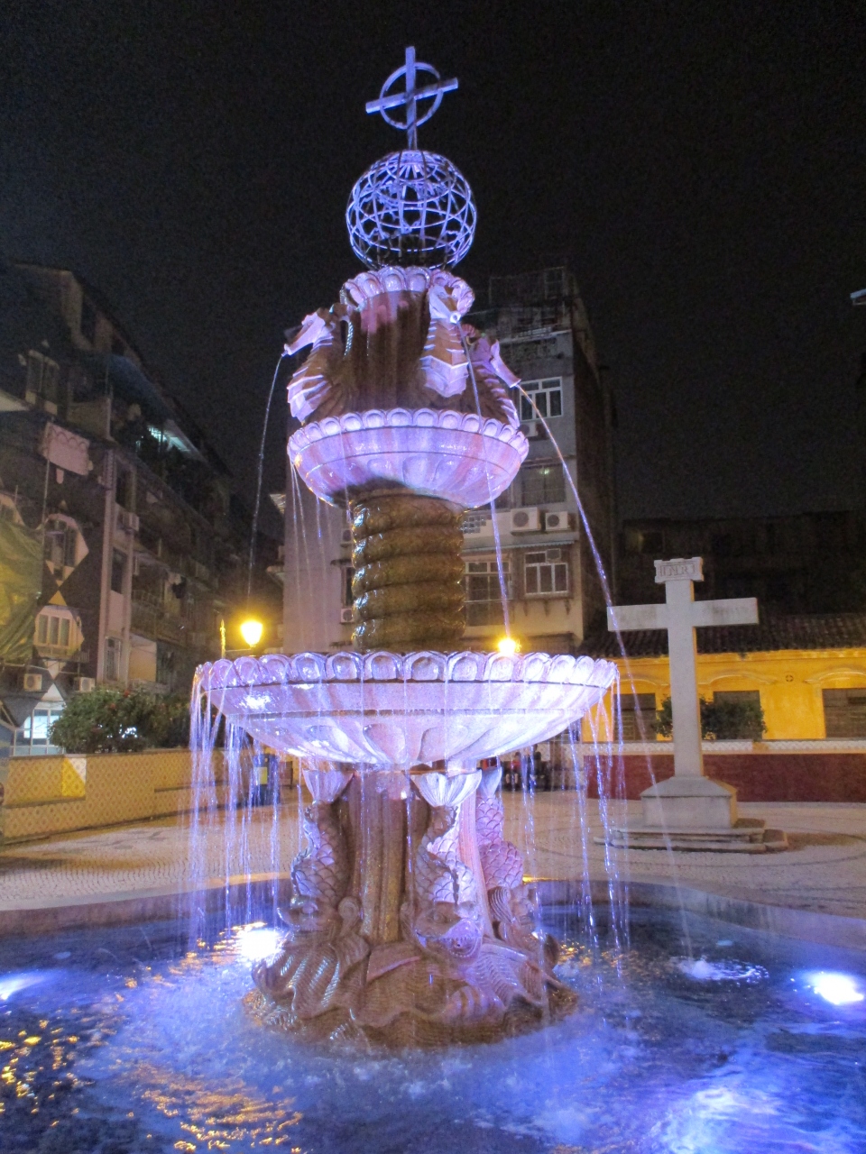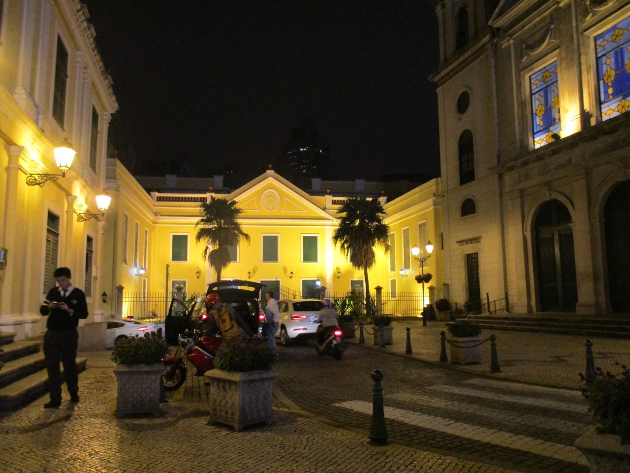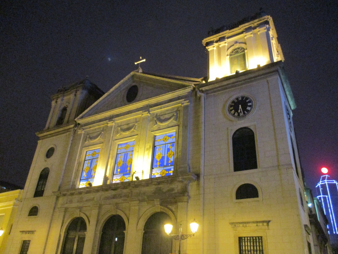 夕食後、すでに暗闇になっていたのですが、広場は明るく照明が灯り、教会内には入れませんでしたが、外側からステンドグラスを見学しました。