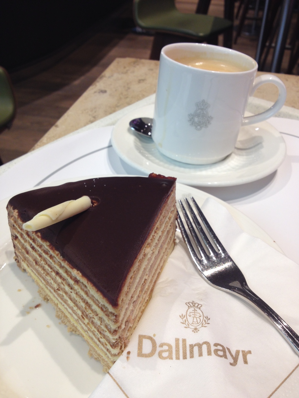 街中のダルマイヤーに行けなかったので帰りの空港店でケーキとコーヒーをいただきました。コーヒーはとっても美味しかったのですが、ケーキが古かったのかチョコがねっとりしていて今まで食べた中で一番不味いケーキでした。
