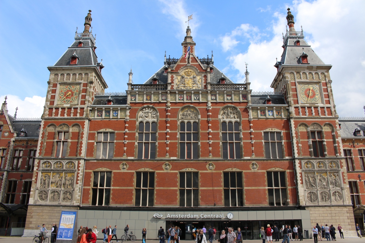 アムステルダムの街は、運河が半同心円状に広がっており、その要の部分にアムステルダム中央駅があります。駅舎は壮麗な建物で東京駅のモデルとなったと言われていますが、東京駅よりも壮麗です。駅前は多くの観光客で賑わっており、ビジネスマンの多い東京駅とも雰囲気が全く違いました。