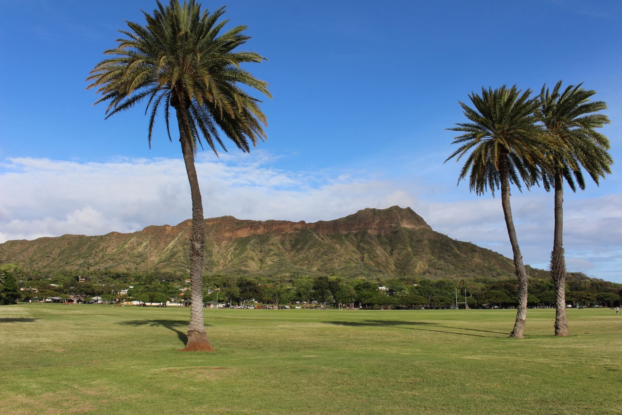 緑の芝生の向こうに、ダイヤモンドヘッドのほぼ全景を見ることができ、大変すばらしい眺めです。結構歩きますが、途中まで海沿いですし、散策がてら歩いてみるとよいと思います。