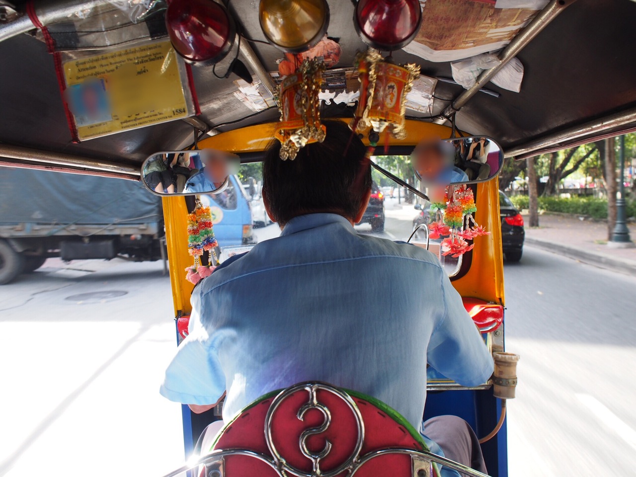 ワットポーへ向かう途中、親切そうに話しかけてきたおじさん。なんでもワットポー周辺は国王逝去に伴うセレモニー開催中で車は一切通れないため、ボートで行くしかないとのこと。そこでボート乗り場まで40バーツで行くというトゥクトゥクに乗って向かうも、着いたところはボートトリップ乗り場でひとり1200バーツもするとのことで、はっきりお断りしたところ、私たちを連れてきたトゥクトゥクのドライバーがワットポーまで300バーツで行くよとのこと。。。え、行けないんじゃないの。。。と思いつつ、ここで降ろされたままだとどこへ行けばよいかわからなかったので、仕方なく言い値でワットポーまで向かいました。なんだか高くついて後味悪かったです。。ちなみに窓がないため排気ガスをたくさん吸うことになりますし、乗り心地はイマイチ。。クーラーのついたタクシーのほうがずっと快適です。経験として乗るのは楽しいと思いますが、価格交渉はしっかりすることをおすすめします。
