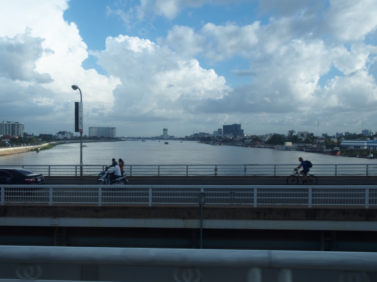 トレンサップ川はプノンペンの市街地の東側を流れている大きな川です。乾季に入っているためか、橋の上から見ると水量は少ないように感じました。川の水は濁りもなく、ゆるやかに流れていました。トレンサップ川は名前のように巨大湖のトレンサップ湖からカンボジアの中央部を流れてきている川です。