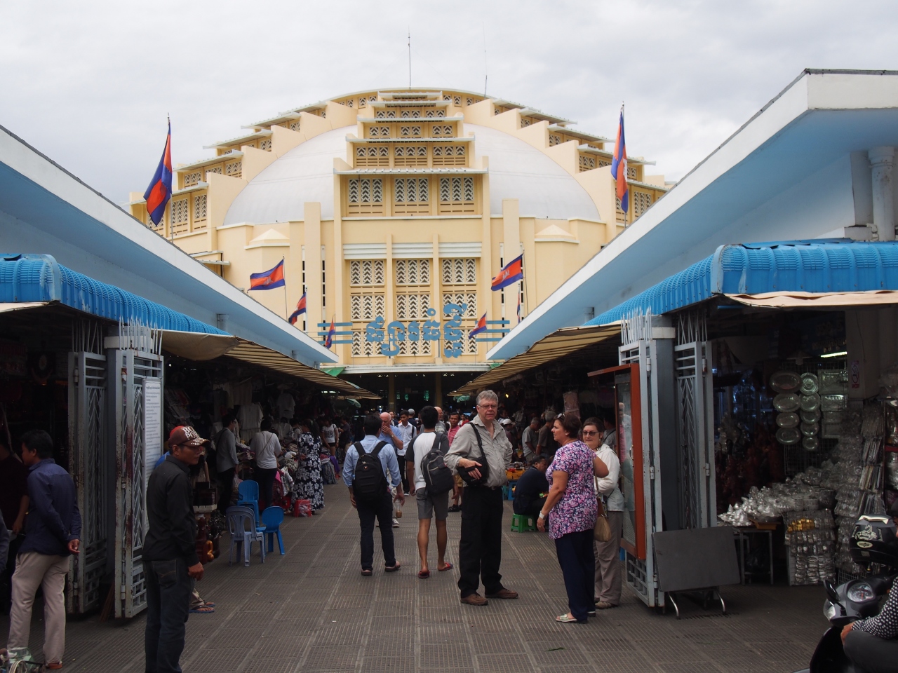 プノンペンで最も有名なマーケットです。地元の人も多いですが、観光客も多くいます。マーケットは中央部がドーム状になり、それから店が四方の広がっています。中央部のドーム内には時計、宝石などの貴金属のお店が並んでいて、四方には衣類、雑貨、食料品などの店が続いています。見て回るのは楽しいのですが、買い物したいものは残念ながらありませんでした。