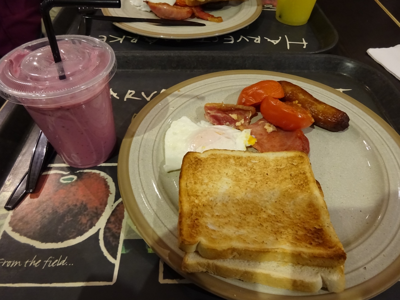 アイルランドの航空会社、エアリンガスを使用。このターミナルでは自動チェックイン機がたくさんあったので、どこにも並ばず手続きができました。手荷物検査場を通過した後の半セルフのレストランでは、アイリッシュブレックファストとして、トマト、マッシュルーム、ベーコン、ソーセージ、フライドエッグ、ビーンズなど並んでいるところから、自分の好きなものを選ぶことができました。