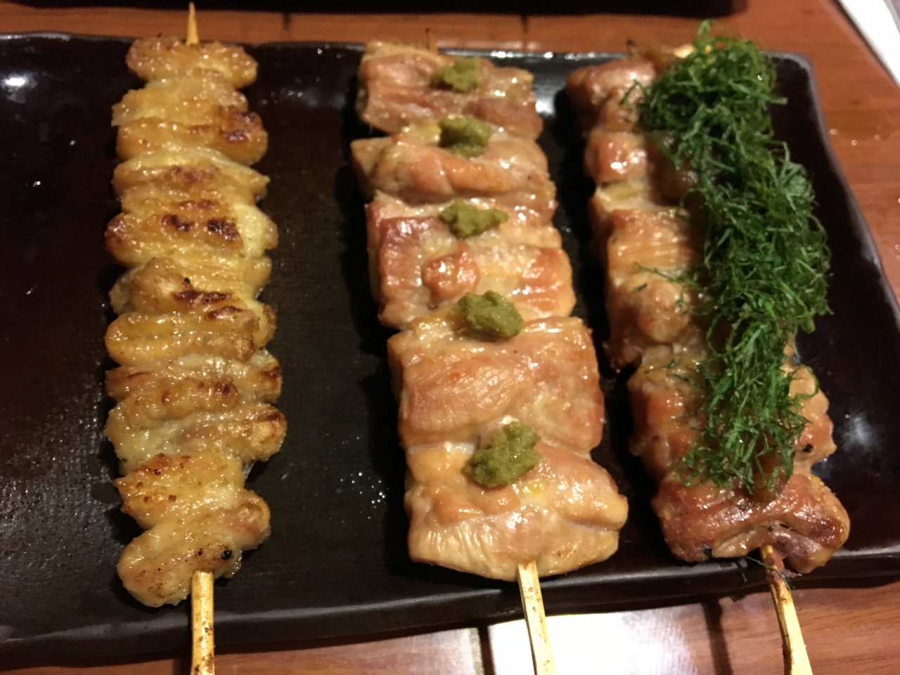昼間おそばを食べに行っても、焼き鳥を頼む人が後をたたないくらい、焼き鳥類の美味しい店。必ず頼むのはとり皮。ここのとり皮は外がカリカリで内側はネットリとした食感が美味しい。豆腐やスライスオニオンのサラダも美味しい。なんたって削りたての鰹節がたっぷりかかってくるからダシの味がすごいのだ。