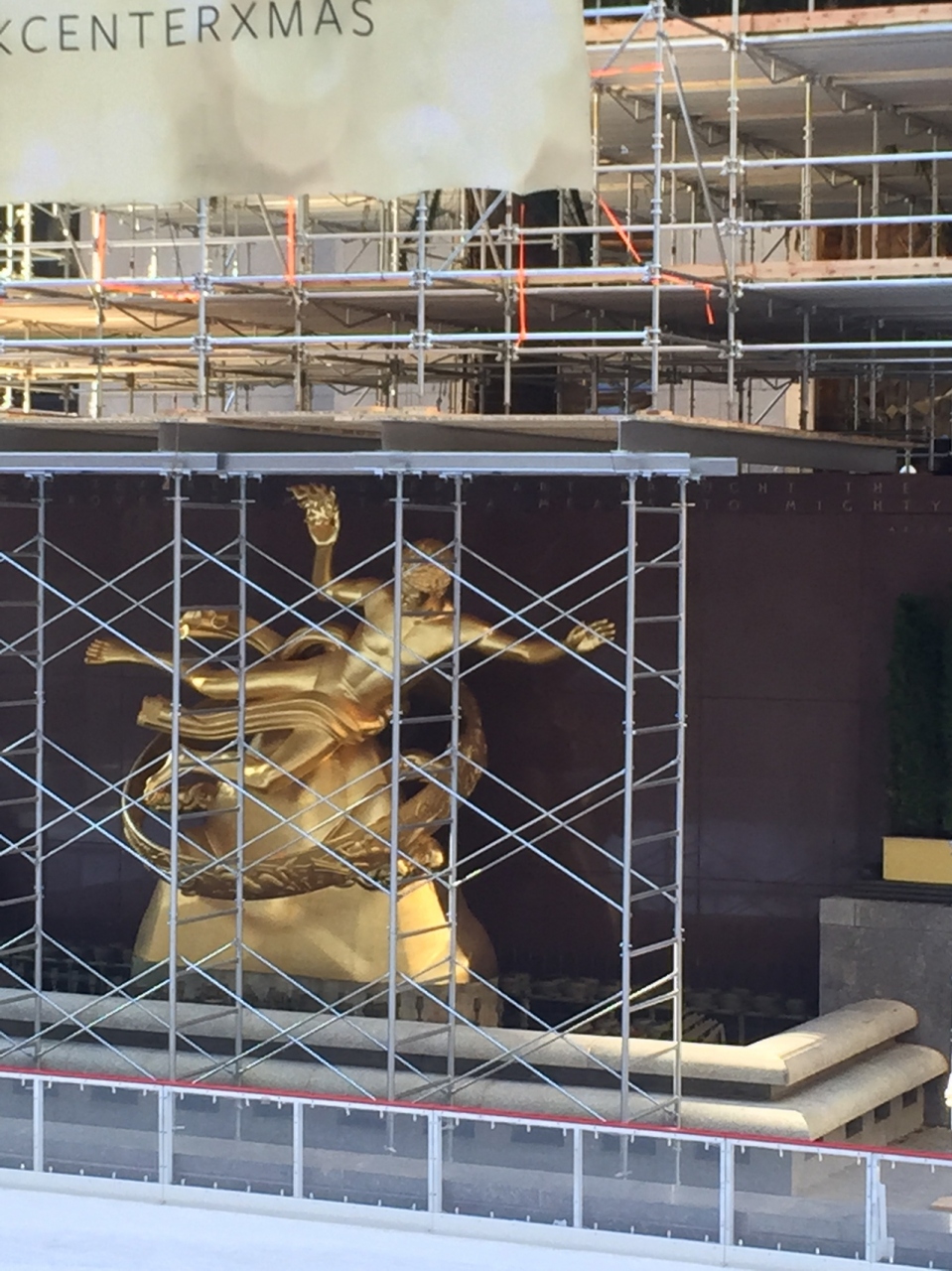 時期的に、スケートリンクができていました。クリスマスツリーも、ほぼほぼ出来上がったくらいの状態でしたが、逆に完成版よりも、なかなか珍しかったかなと思いました。スケートリンクの前部分に入っているショップも、魅力的。