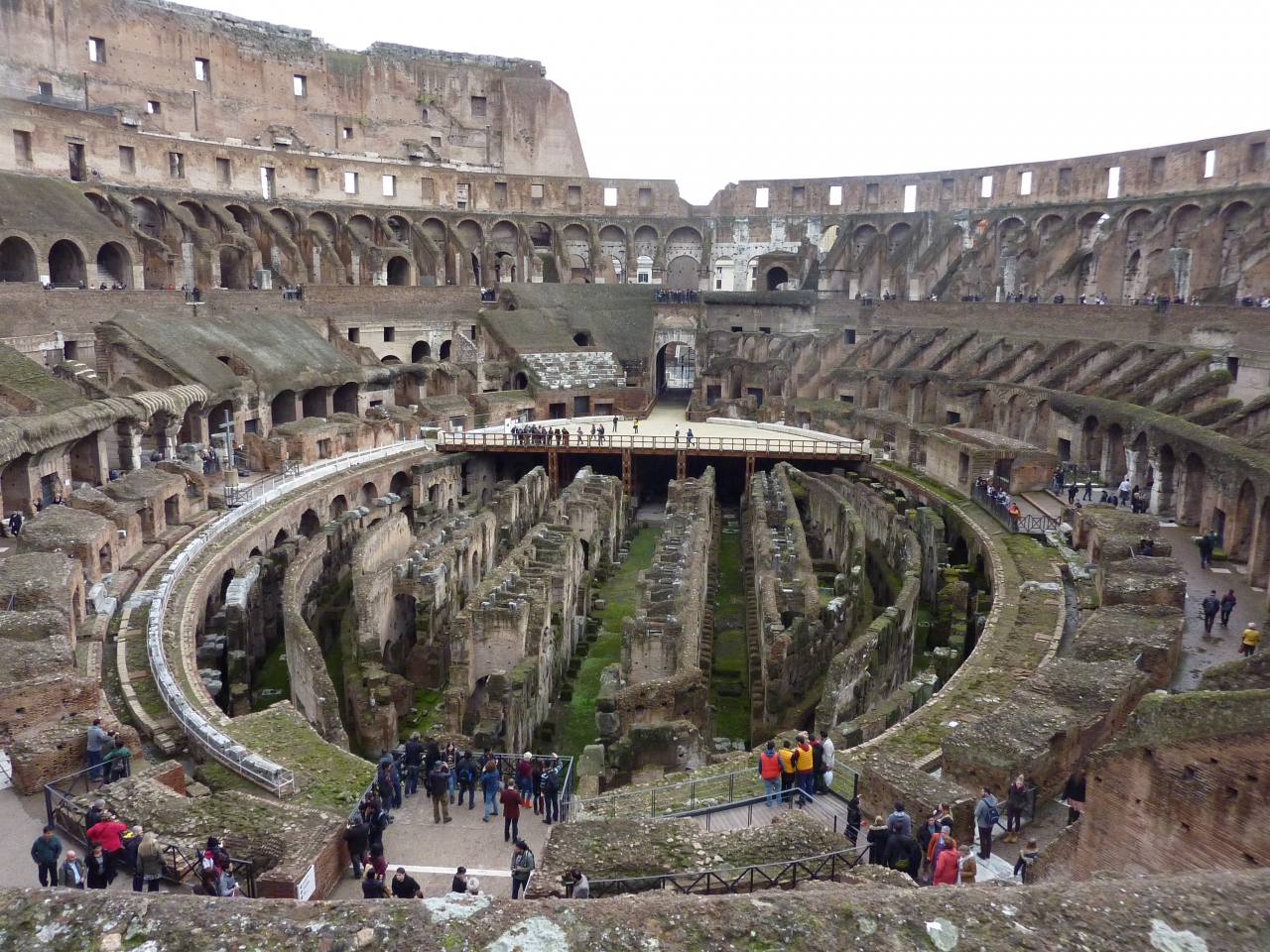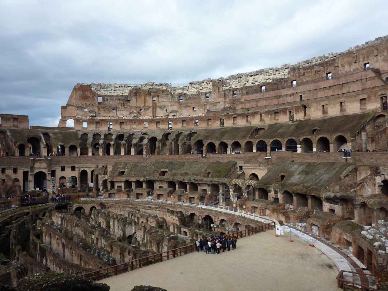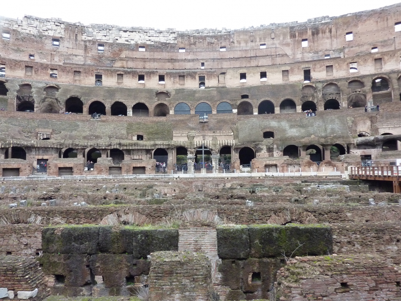 一階下にはステージが造られ、そこから見ている人もいました。直径約540mの半周ほど廻って反対側からコロッセオ全体を見渡せます。一階下がったフロアからはスタジアムを見上げるようになり、又もその大きさに圧倒されます。