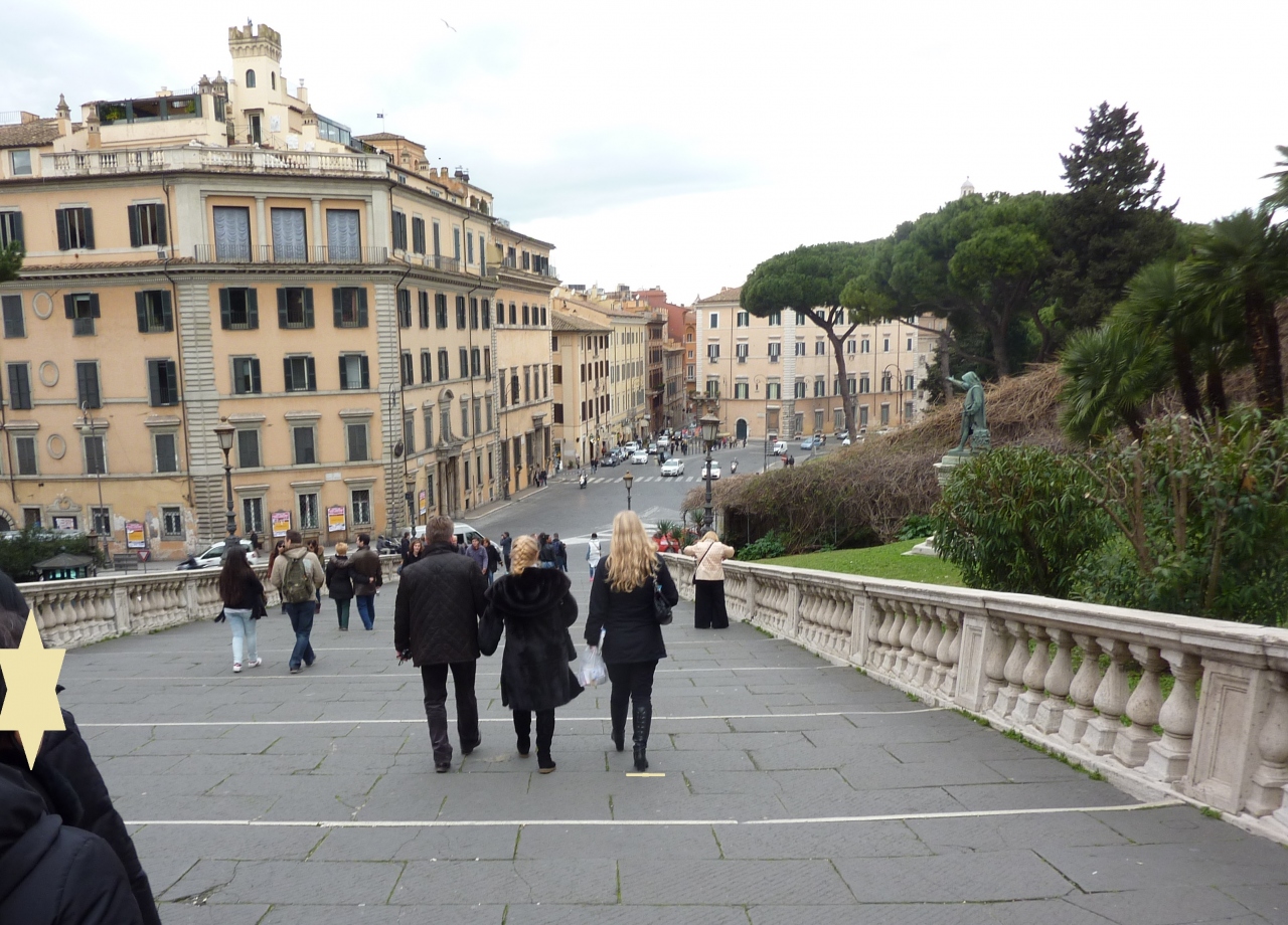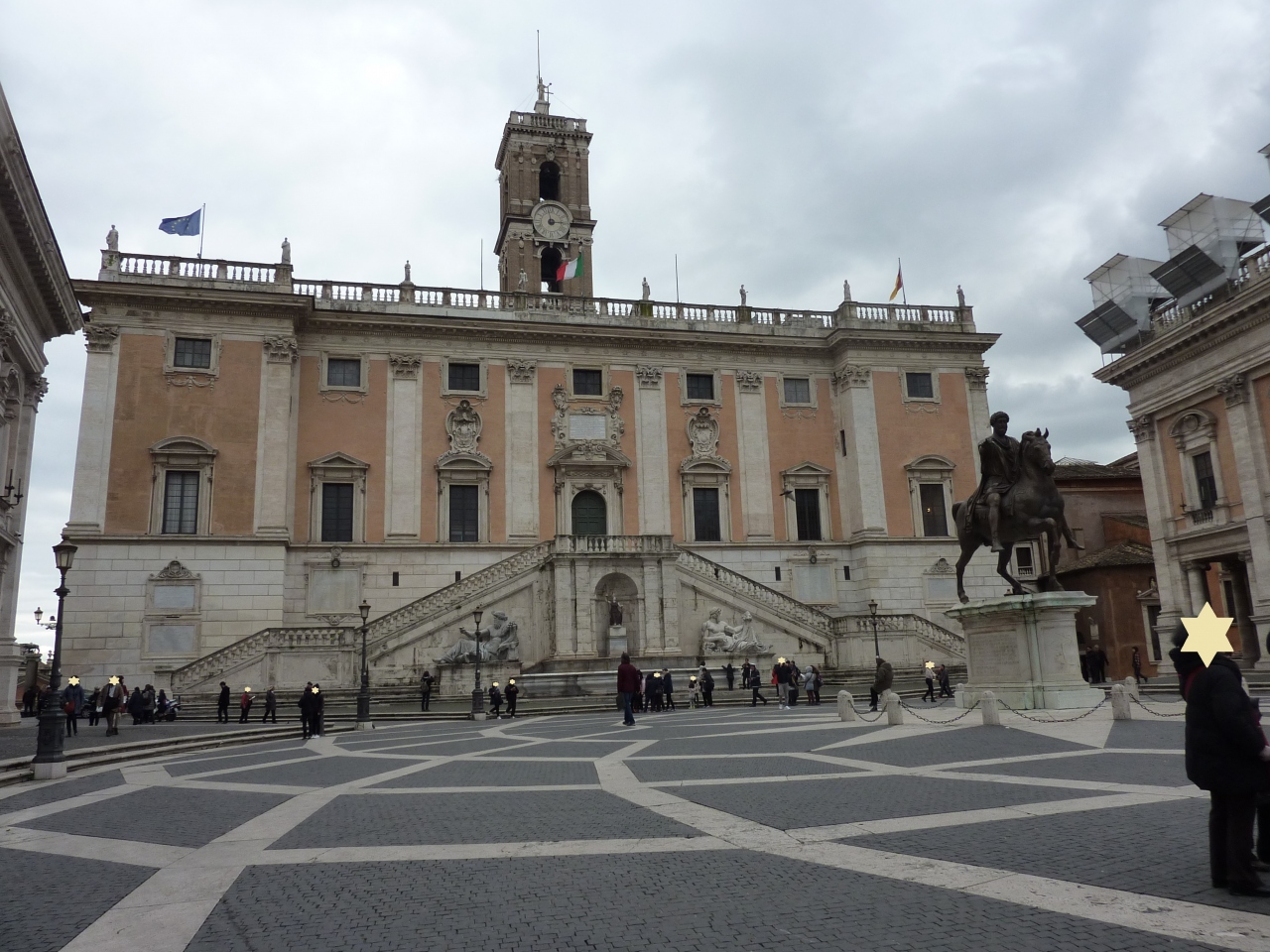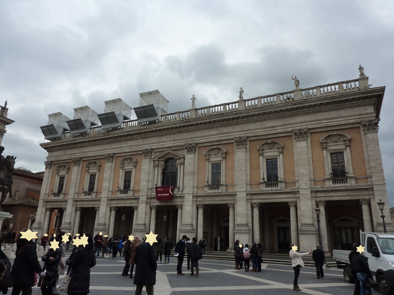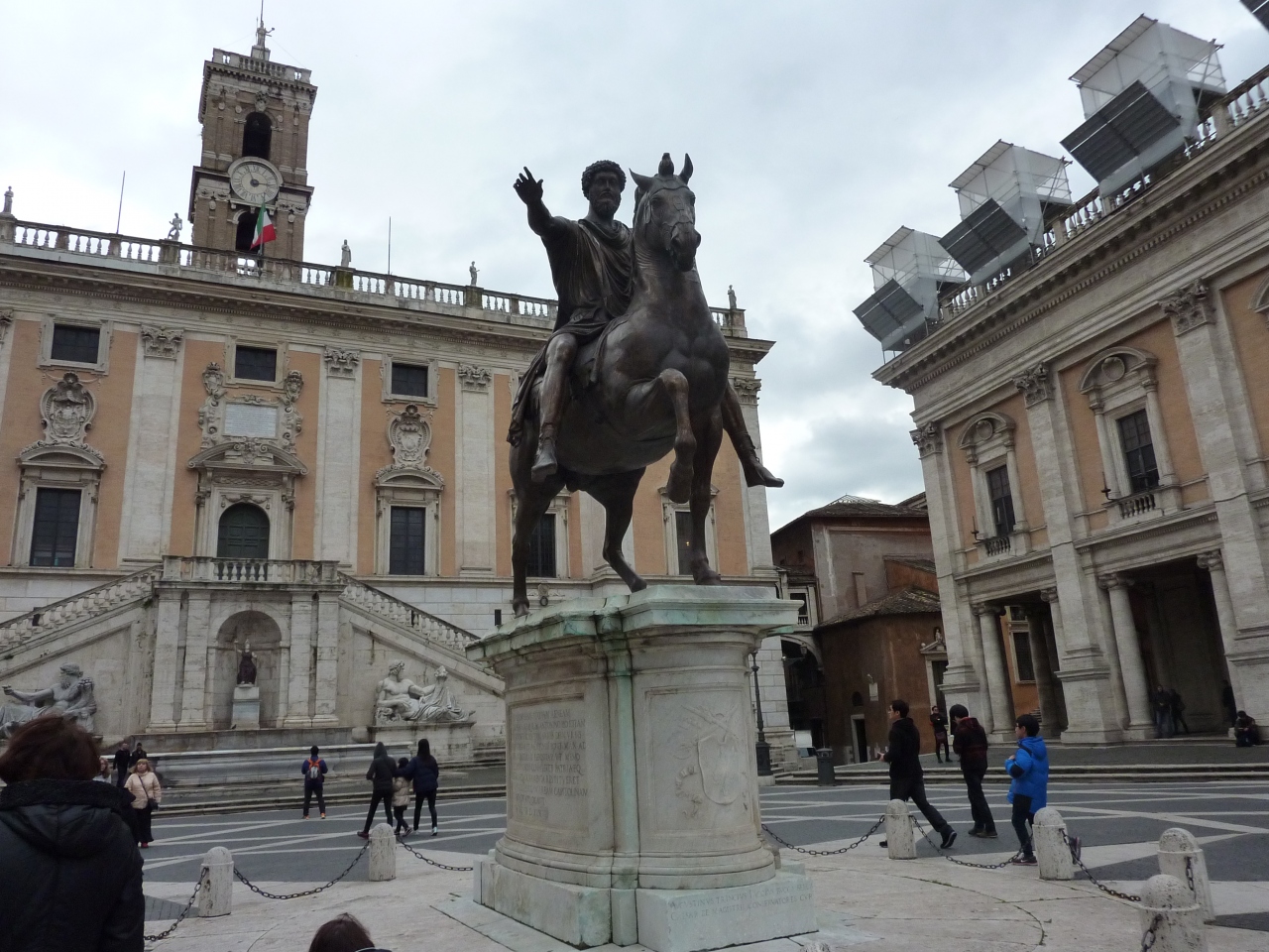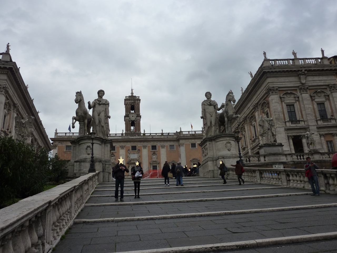 フォロロマーノ見学の後、廻ってきました。英語のキャピタルの語源、カンピドーリオは古代ローマの中心地で数多くに神殿がありましたが、ミケランジェロの設計で幾何学模様の敷石で埋められた広場になっています。階段下から見ると広場を囲むルネッサンス様式の建物が一点透視を考慮して造られているのが判ります。