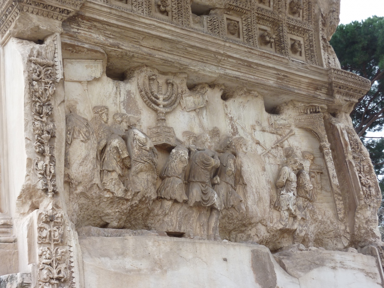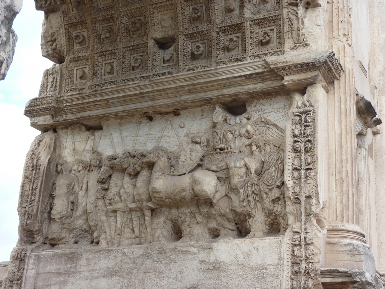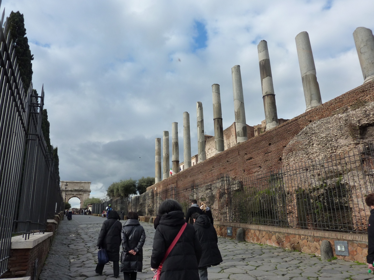 コロッセオ川から聖なる道を歩くと先ず目に入る凱旋門です。ユダヤ戦争勝利を記念して西暦81年に建てられました。アーチの内側にはティトス帝が凱旋戦車に乗り、ユダヤ人捕虜が燭台を携えて行進する姿を描いたレリーフが彫られています。当時の姿が良く表され、聖なる道から見ると入場門の様に見えます。