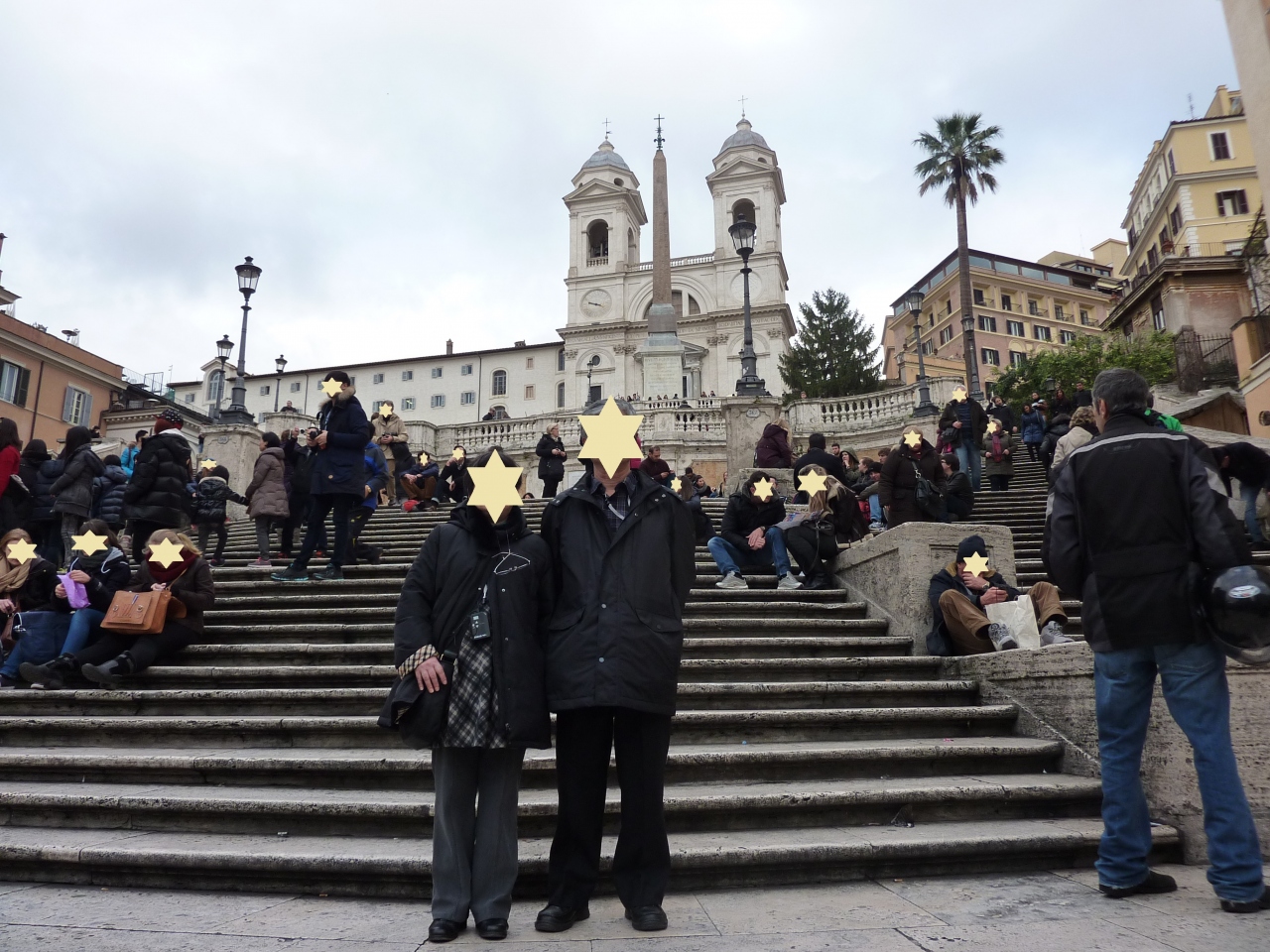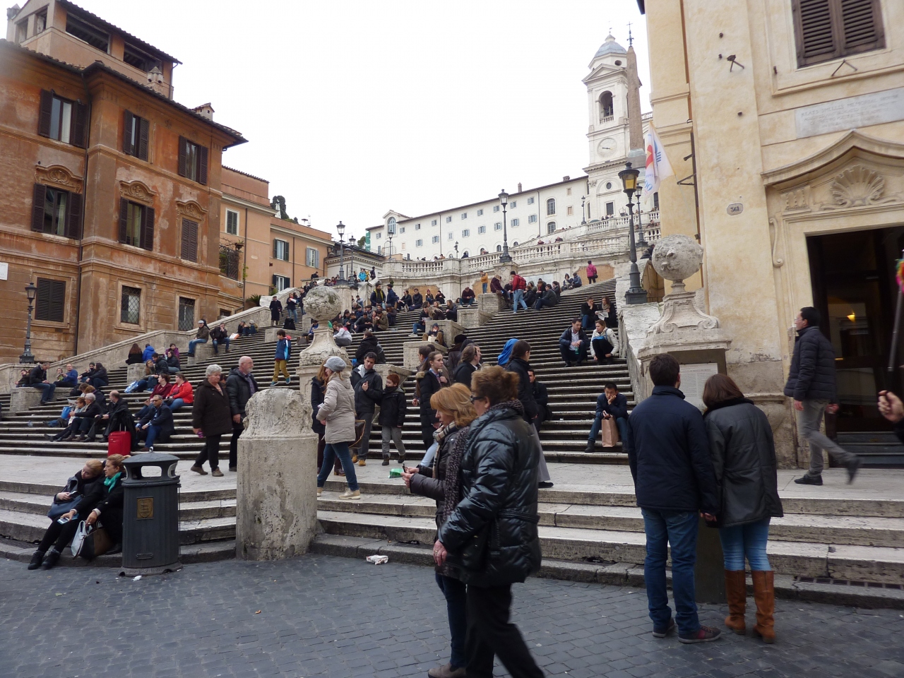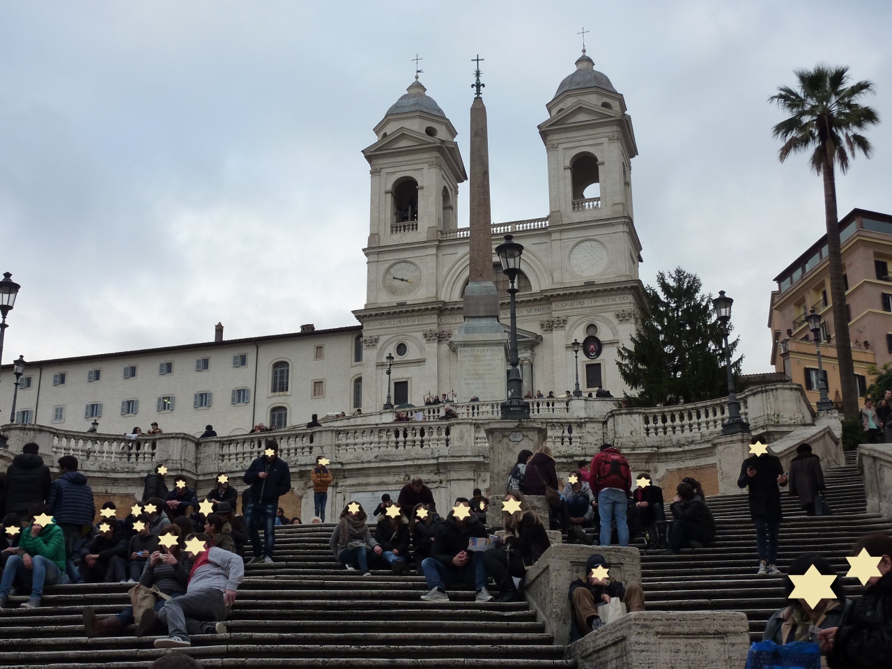 古代エジプトのオベリスクが立ち、トリニタ・デイ・モンティ教会がステキな背景になっています。スペイン階段は踊り場は勿論、階段のいたるところに観光客が座り込んでいるので、ルートを探しながら階段を登りました。結構段数のある階段でした。