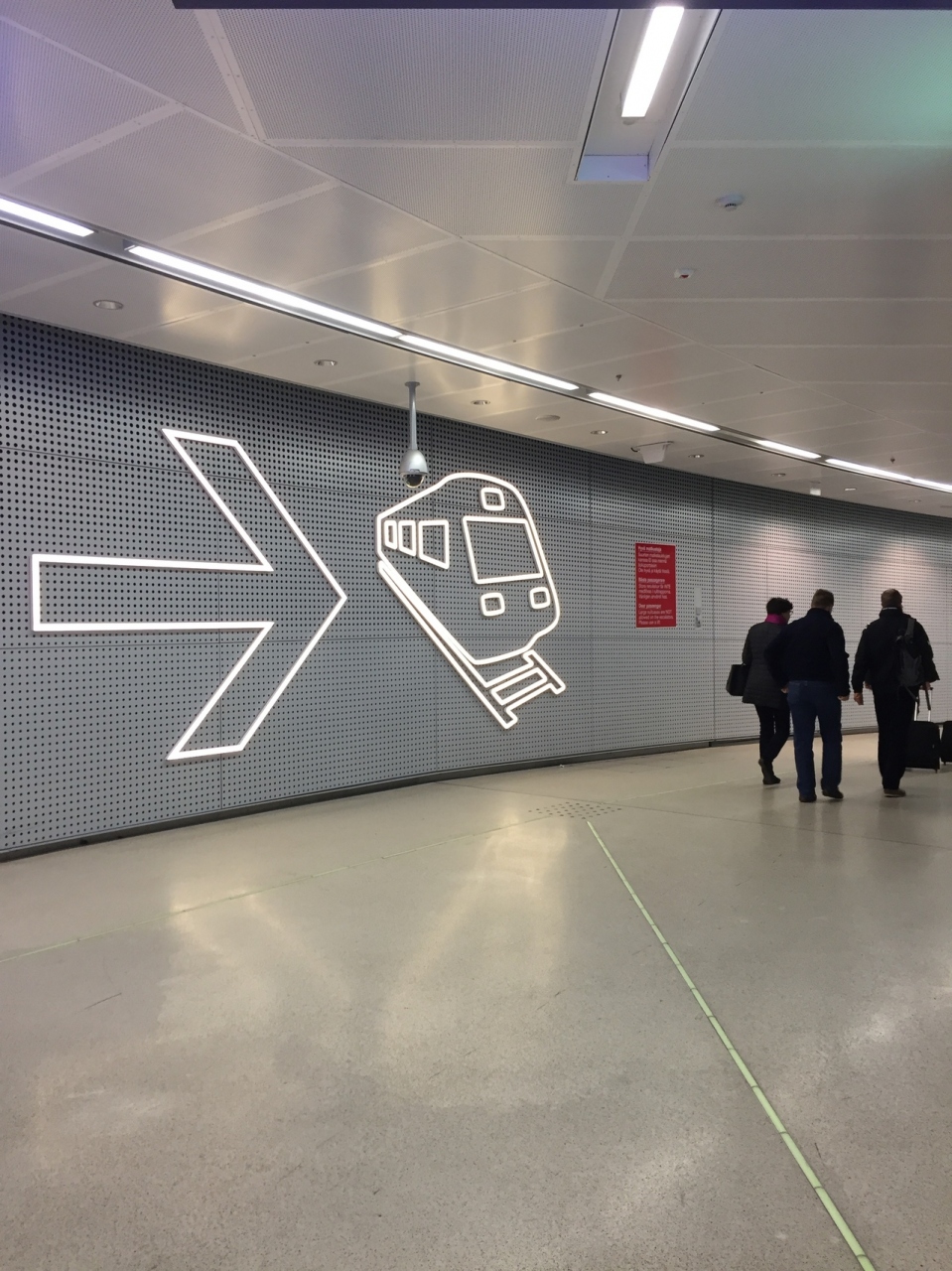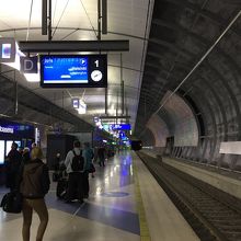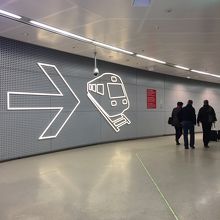 昨年ついに開通した空港駅。夏の開通当初は駅がターミナルとつながっていなかったようですが、現在は二つのターミナルの中間部分から接続するように通路が出来ています。大きな鉄道のイラストが書かれたサインがあるので、初めてでも迷いません。中央駅までは2路線が走っており、環状線P線(時計回り)とI線(反時計回り)のどちらに乗っても約30分で中央駅まで到着します。P線が数分だけ早いらしいです。料金は片道5.5ユーロ(2016年10月現在)。10分間隔の運行のため、バスより頻繁に来て便利。