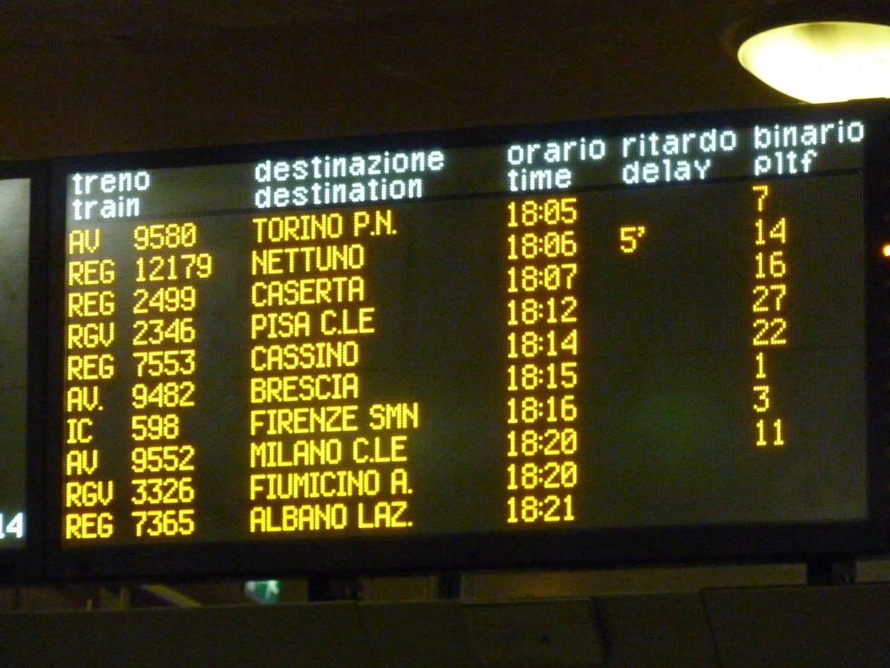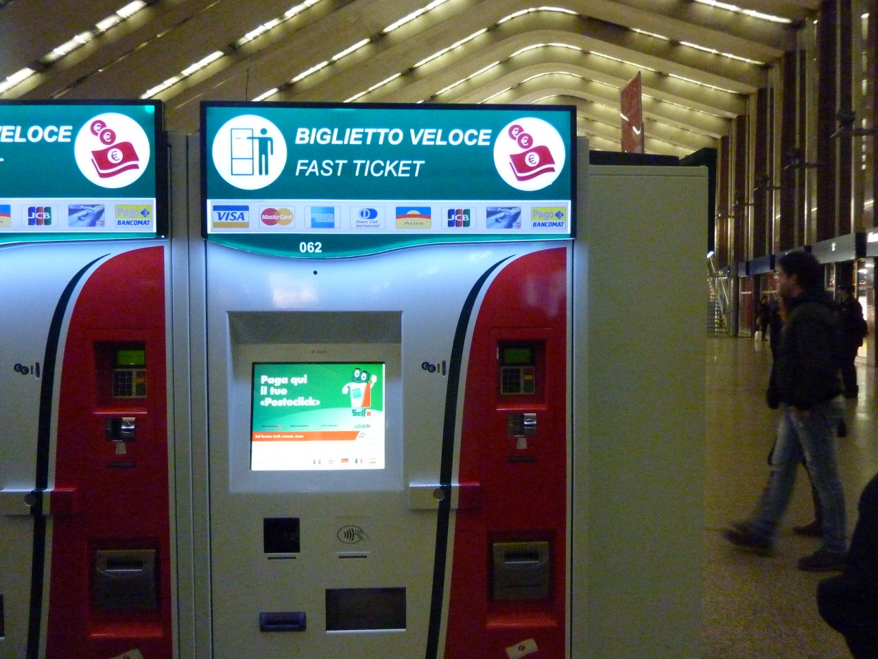 ローマに入る列車の終着駅、英語のターミナルがテルミニになります。内部は明るく近代的な造りでセルフサービスの自動券売機がズラッと並ぶさまは壮観です。夜でも利用客が多く、何本もの列車が出発して行きます。