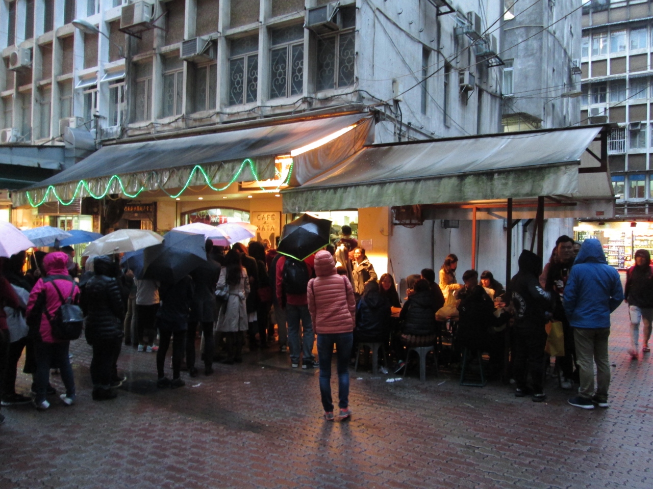 11月のマカオは晴れる日が多いとされていますが、2泊とも朝夕に雨が降りました。雨季のようにしとしとと降っている夕方でしたが、マーガレットカフェナタの前にエッグタルト目当てのお客さんが長い列を作っていました。行列の絶えないお店です。
