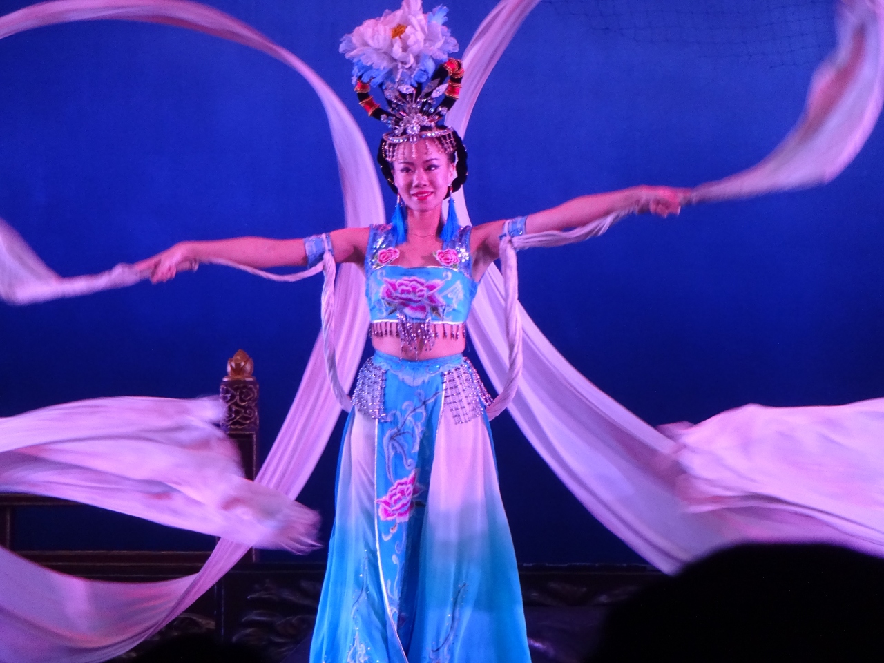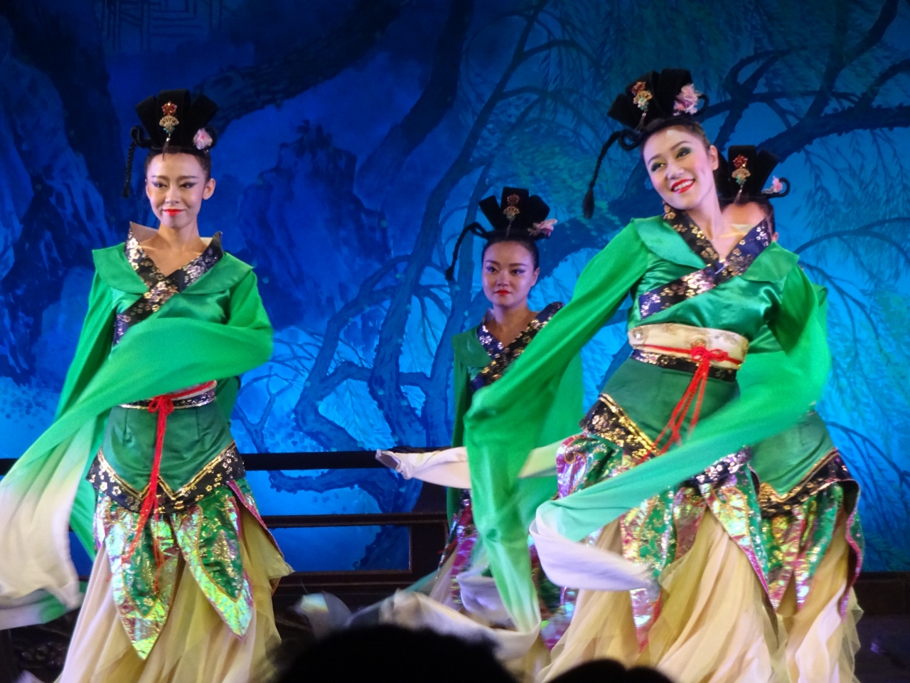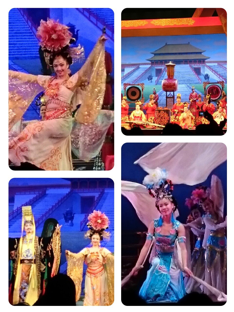 蒸してあるのでカロリーは抑え気味なのか・・・正直自分の作った餃子の方が美味しいと思いました。食事の後の歌劇は、玄宗皇帝と楊貴妃のロマンスをベースにしたレビューです。中国語と英語で解説が付きますが、踊りと音楽中心なのでそれなりに楽しめます。