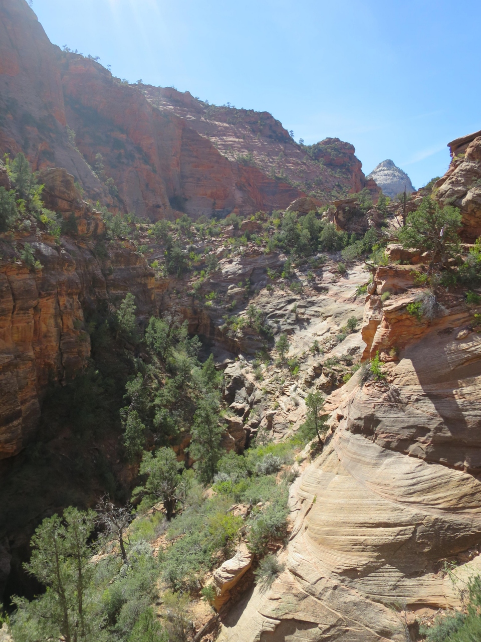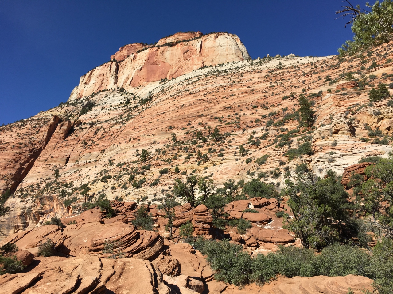 マウント・カーメル・トンネル出口にある駐車場から0.3マイル(500m弱)のトレイルをゆっくり登ること20分、オーバールックに着きます。そこからザイオン・パーク・ブールバードの渓谷を挟む両側の断崖をまっすぐに見渡すことができ、まさに絶景です。ザイオン国立公園一番の眺望と言って過言ではないと思います。