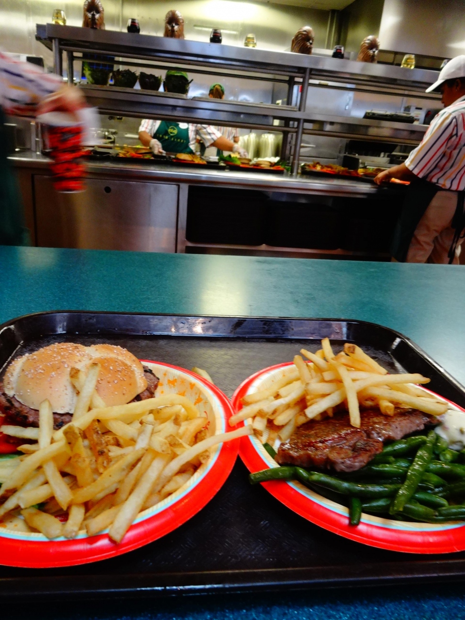 ハリスタのランチを楽しく迷いこちらに決定。テレビ局のABCが協賛ですね。店内はアメリカのダイナーという感じ。ハンバーガーか迷ったけどステーキにしてしまった。かたい。さすがにアメリカのお肉ですね。スイーツもユニーク。