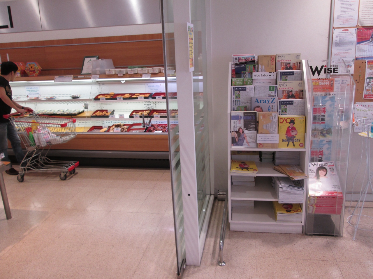 日本のスーパーマーケットと同様、店内では試食のサービスがありました。全般的に種類が豊富でおいしいソーセージが多いバンコクですが、少しずつ味見をして、ホテルの部屋でつまむ惣菜として買ってみました。エントランスの現地情報誌はたくさん置かれており、無料でピックアップできて良かったです。