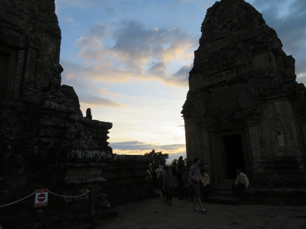 アンコール遺跡に落ちる夕日を見ようと行きました、ジャングル地帯の高台にあるピラミッド式の寺院、最上部に中央祠堂があり麓から石の階段を歩いて登ります、夕方から夕日を鑑賞する人で賑わっています、早くから場所取りをしている人も多いようです、夕日が見えるはずでしたが今回は見えませんでした、ジャングルだけを見ることが出来ました。