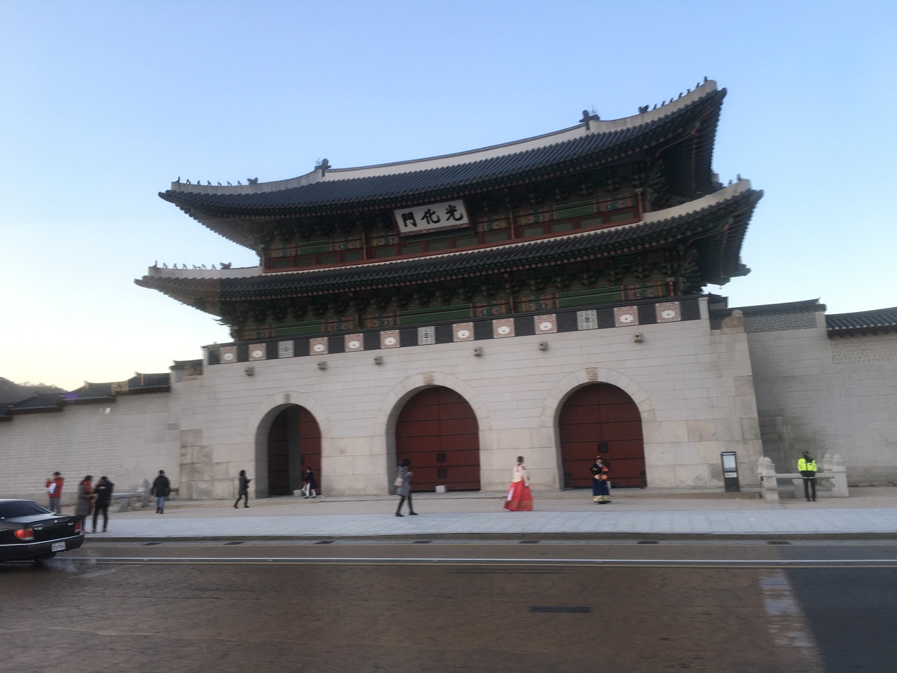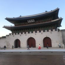 キョンボックンの正面の門です。正面の道路は光化門広場に行く凄く広い道路です。韓国と言ったらここはまず外せませんぐらいの見応えが有ります。チケットを購入して門を入ると日本語ガイドツアーの時間が書いてあるので、絶対にガイドさんツアーで見られた方が良いです。歴史を感じますよ。