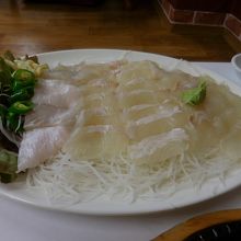 たくさんの一品料理の後、刺身とアラを使った鍋が出てきました。どれもとてもおいしかったです。ちゃんと醤油とわさびも用意されています。量が多いので、二人以上で行くことをお勧めします。