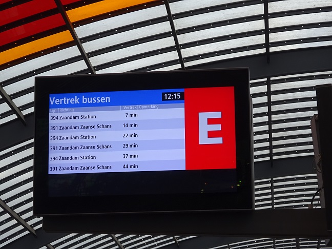 AMS中央駅のバス乗り場は、以前のC乗り場から変わって、中央駅裏側のG乗り場になっています。G乗り場の「E」から。シーズンオフの平日でも15分毎にきます。始発がAMS中央駅、終点がザーンセスカンス村入口なので、らくちんです。2016年12月バス代は、1日券10ユーロでした(往復)。