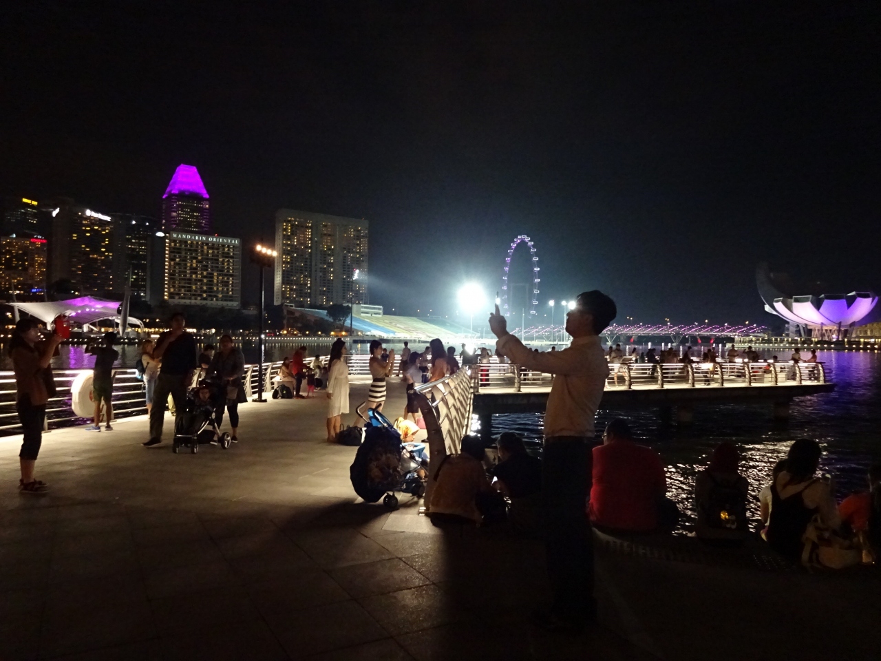 マリーナ湾に、マーライオンを眺めるための遊歩道が突き出ていました。遊歩道には、四角い石のベンチがチラホラ設置されています。