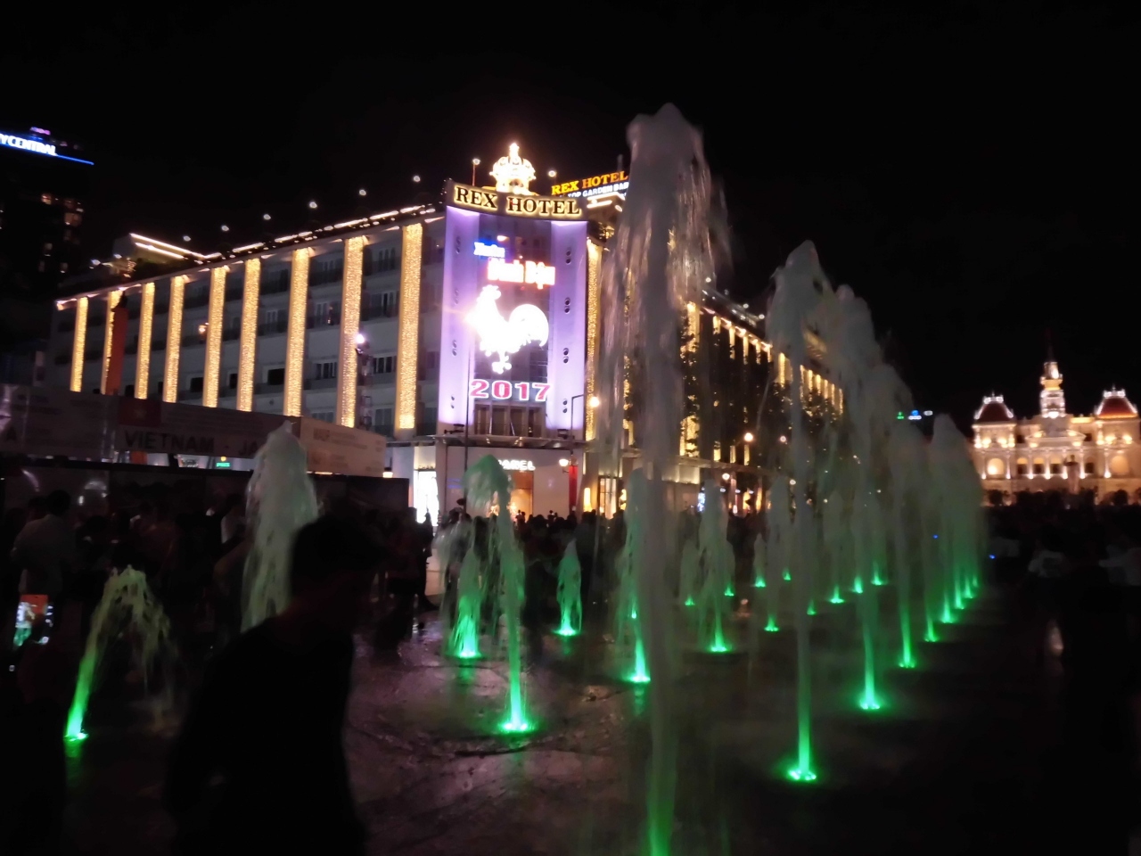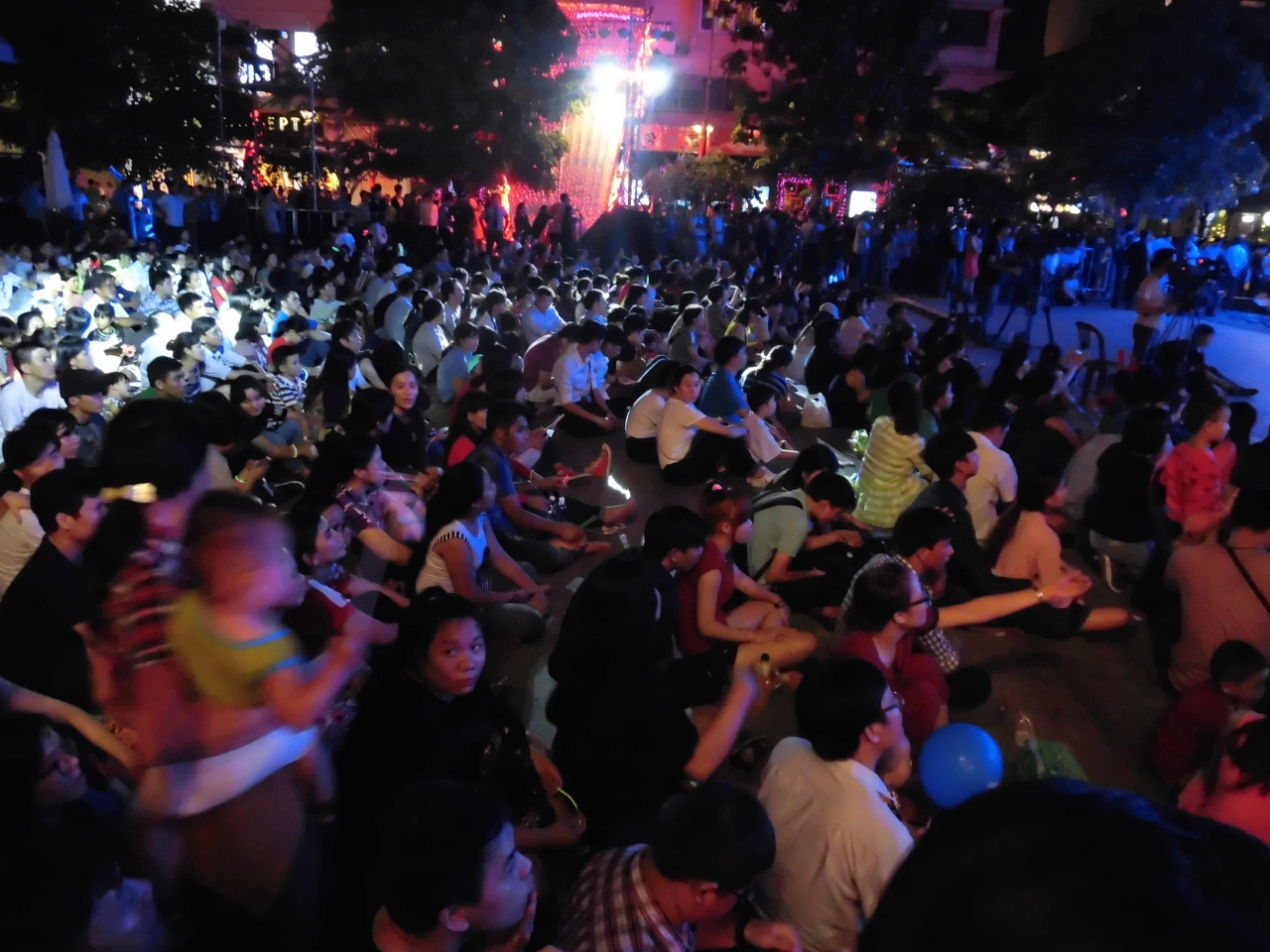 2016年のクリスマスイブのイルミネーションの写真をお届けします。グエンフエ通りの両側の車道も歩行者天国になっています。その道路の上には綺麗なイルミネーションがあります。まだ通り中央のサイゴン川寄りの所に特設ステージが設けられ、夜に歌謡ショーが無料で行われていました。とにかくすごい人出で歩くのも大変ですが、市民の楽しみ方に接するには一番良い場所です。