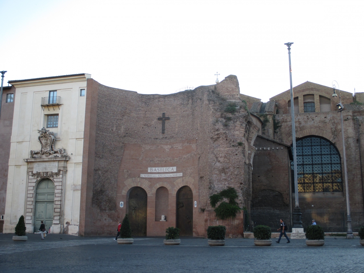 共和国広場にあります。すでに朽ち果てているという感じの教会です。しかし、この外観は、古代ローマの遺跡を損なわないようにと、ミケランジェロがこのようにデザインした教会なのです。この斬新な建築物はさすがミケランジェロです。