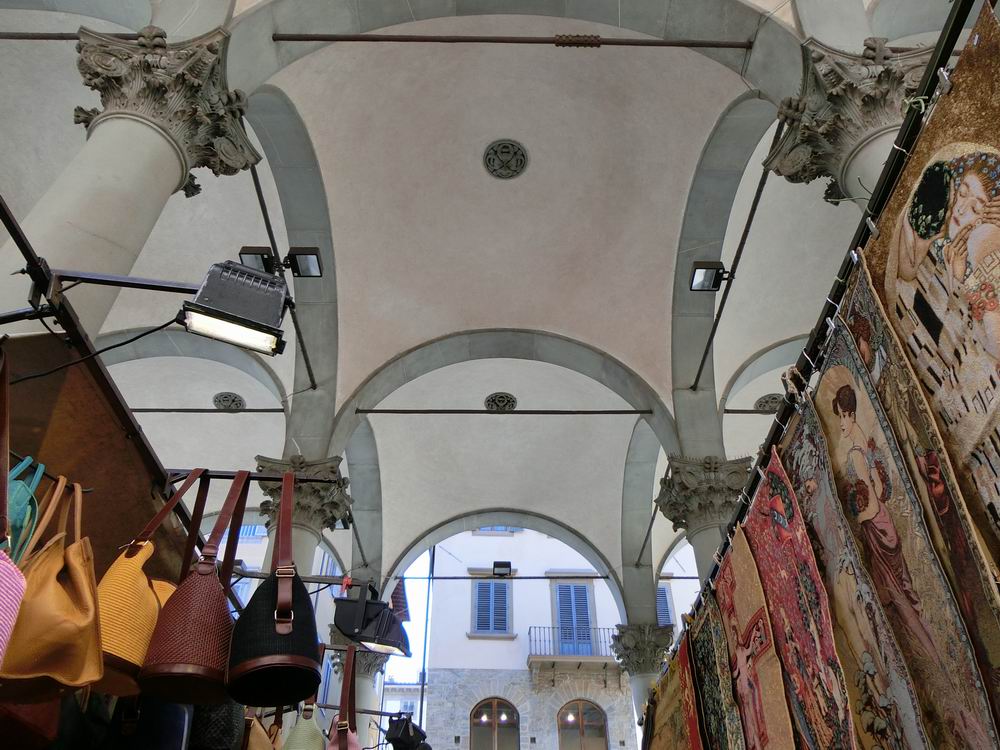 レプブリカ広場にあった旧市場に対して、16世紀に造られたこちら側を新市場と呼んでいるそうです。場所はレプブリカ広場とポンテヴェッキオの中間付近。支柱が多数並ぶ開放的な建物なので分かりやすいです。建物の下は観光客相手の市場になっており、カラフルな革のバッグや衣料品などが売られていました。女性には掘り出し物が見つかりそうな市場です。