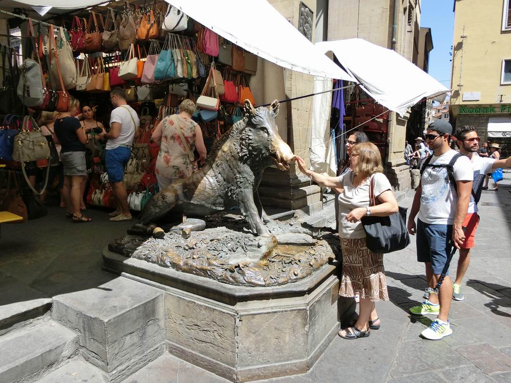 建物の南側には、「子豚」の愛称で呼ばれるイノシシの像(噴水)があるので見るのをお忘れなく!鼻をなでると幸運がもたらされるとのことで、観光客がたくさん来ています。ただし、このイノシシの像は現在はレプリカで、本物はバルディーニ美術館にあります。